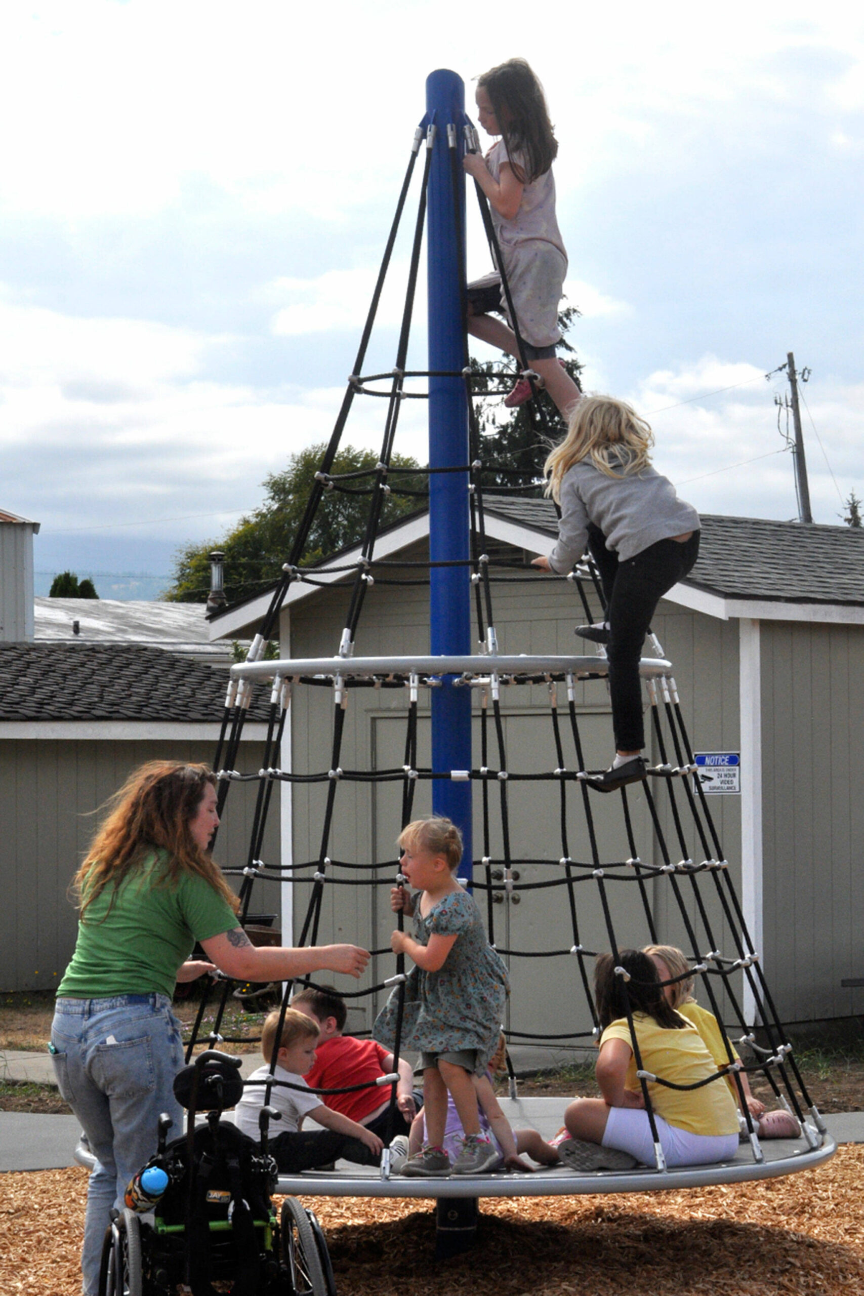Children and adults sampled the new swing set, ziplines, preschool play set, merry-go-round (“Inclusive Whirl”), spinning pyramid (“Cyclo Cone Pyramid”) and stationary musical instruments.