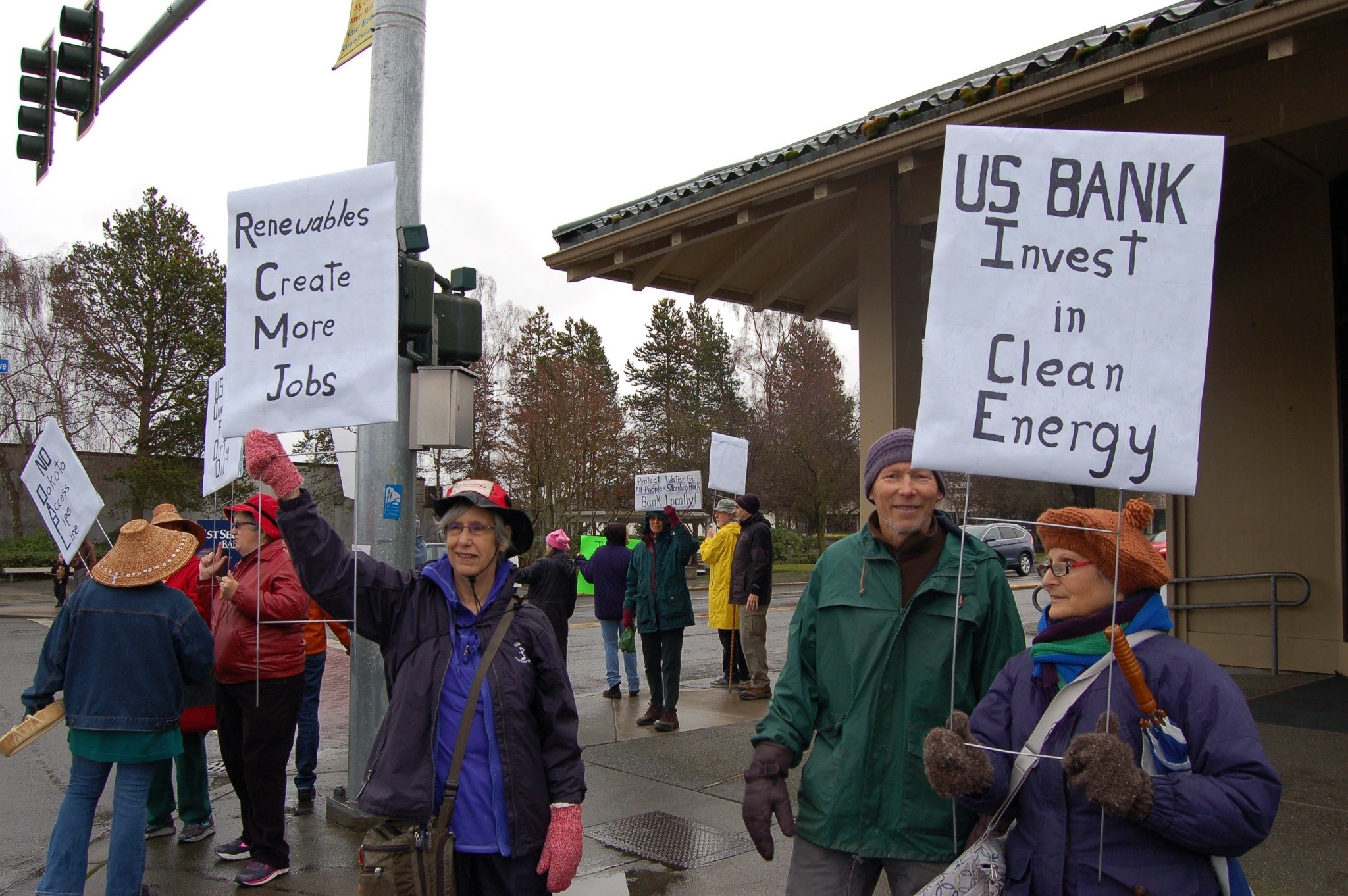 More than 10 protesters stood outside U.S. Bank on the corner of West Washington Street and North Sequim Avenue on Saturday, Feb. 18, with signs encouraging U.S. Bank to divest from alleged financial ties to the Dakota Access Pipeline (DAPL) project.