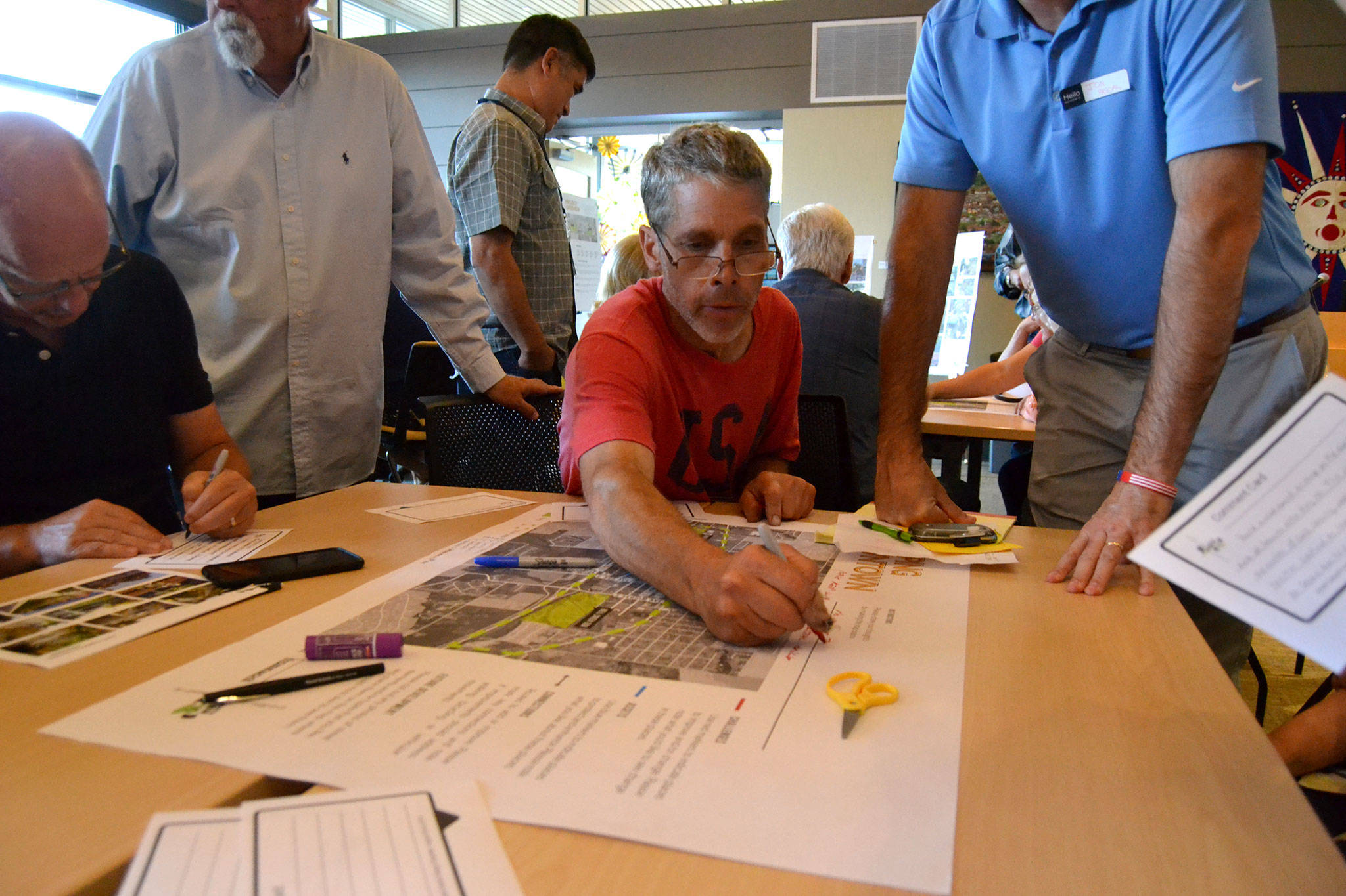 Eric Carey, a Prairie Street resident, marks a map during a South Sequim Complete Streets planning session making a suggestion for new commercial traffic through Prairie Street.