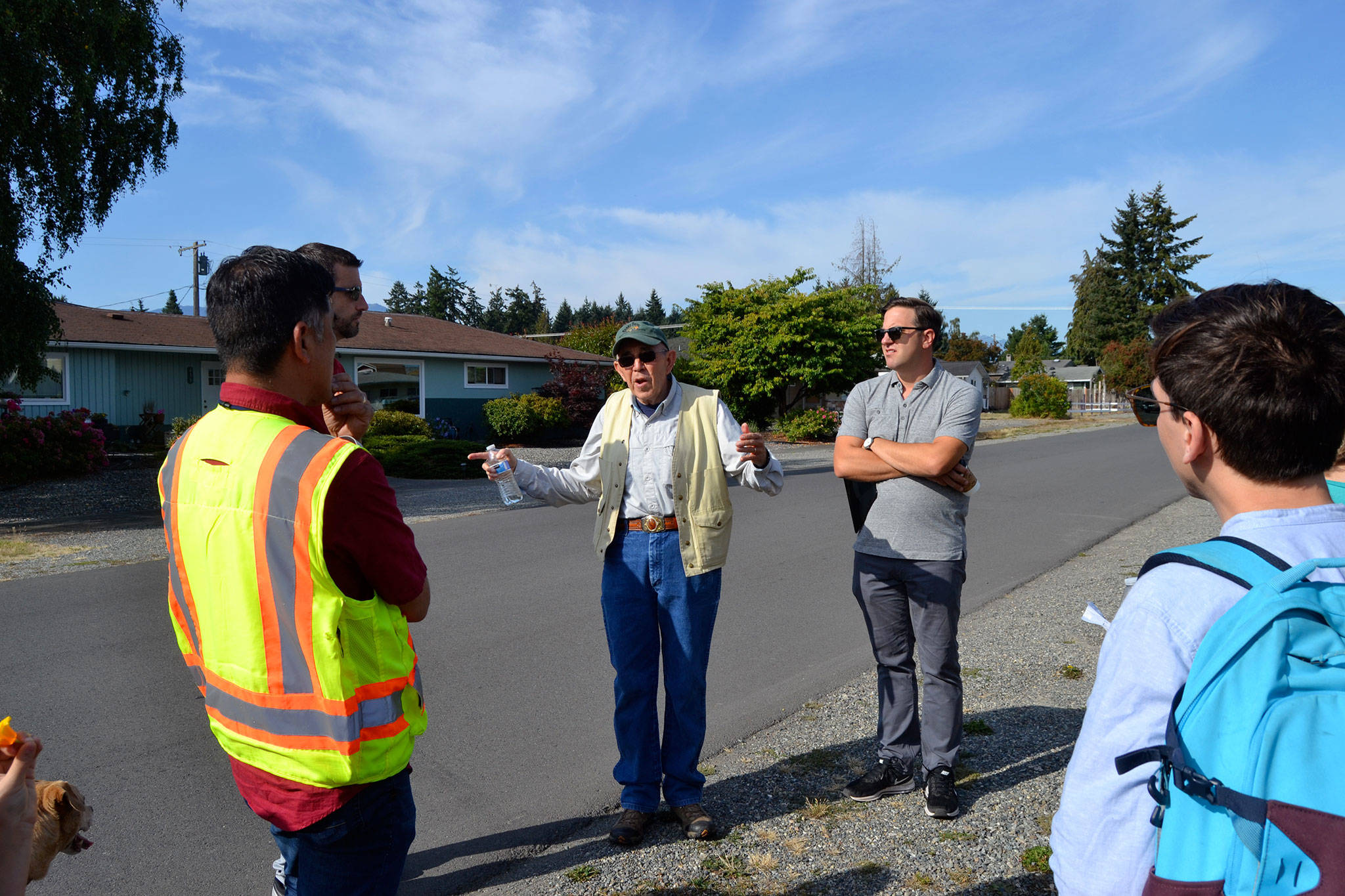 John Viada of Sequim, center, talks with consultants on Aug. 29 about some of the possible issues along Prairie Street and other downtown streets. “I’m interested in planning process,” he said. “I think they’re going to need to do something.” Sequim Gazette photo by Matthew Nash