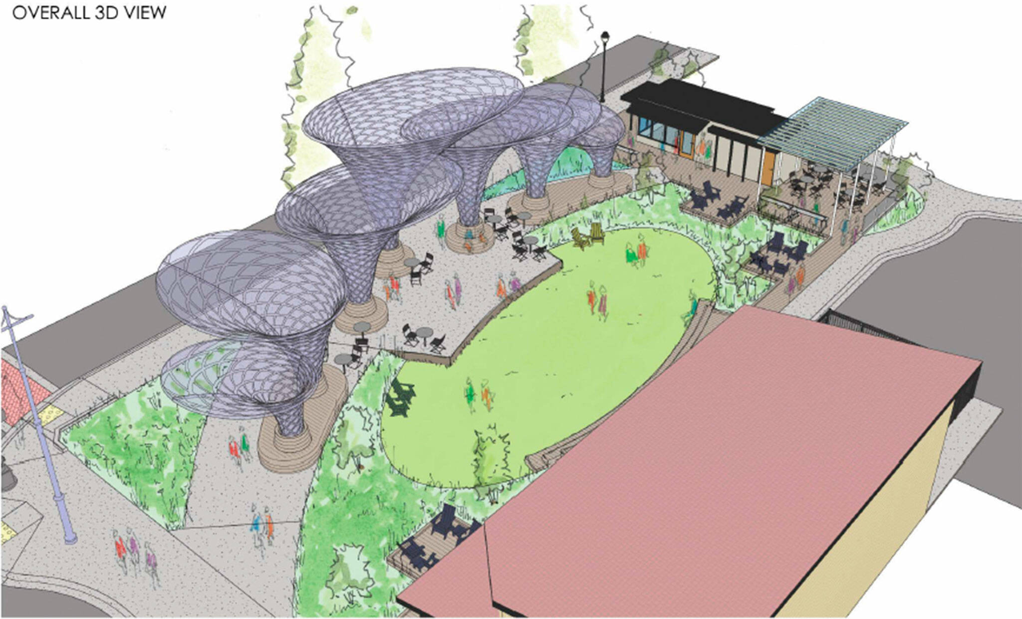 “Woven” shows a stage area surrounded by large sculptures that consultants said could be seen as fungi or waves. It’d also include a sunken lawn area plus a covering by the business area, and a walkway by the sculptures.