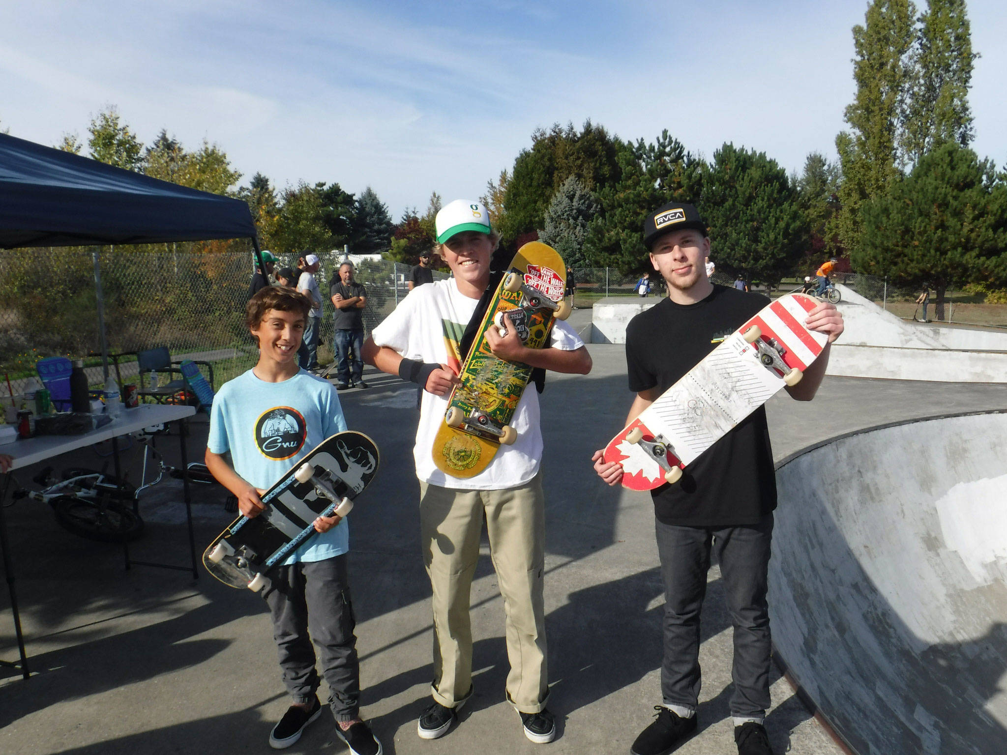 At the Sequim Skate Park’s Oct. 6 contest, winners in the Advanced age 15-19 group include, from left, Cannon Cummings of Agnew taking first, Caleb Wright of California in second, and Riley Cosmo of Sequim third. In total, 200 people participated in the event to support the remodel of the Sequim Skate Park. Photo courtesy of Mark Simpson