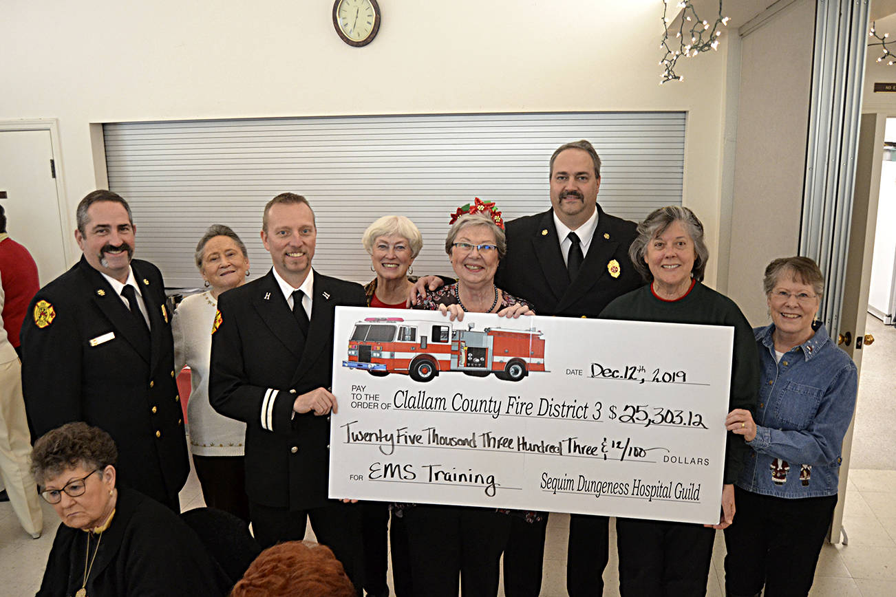 At the Sequim-Dungeness Hospital Guild’s annual volunteer luncheon on Dec. 12 in St. Luke’s Episcopal Church, board members presented more than $25,000 to the fire department for emergency medical services training for firefighters and the public.