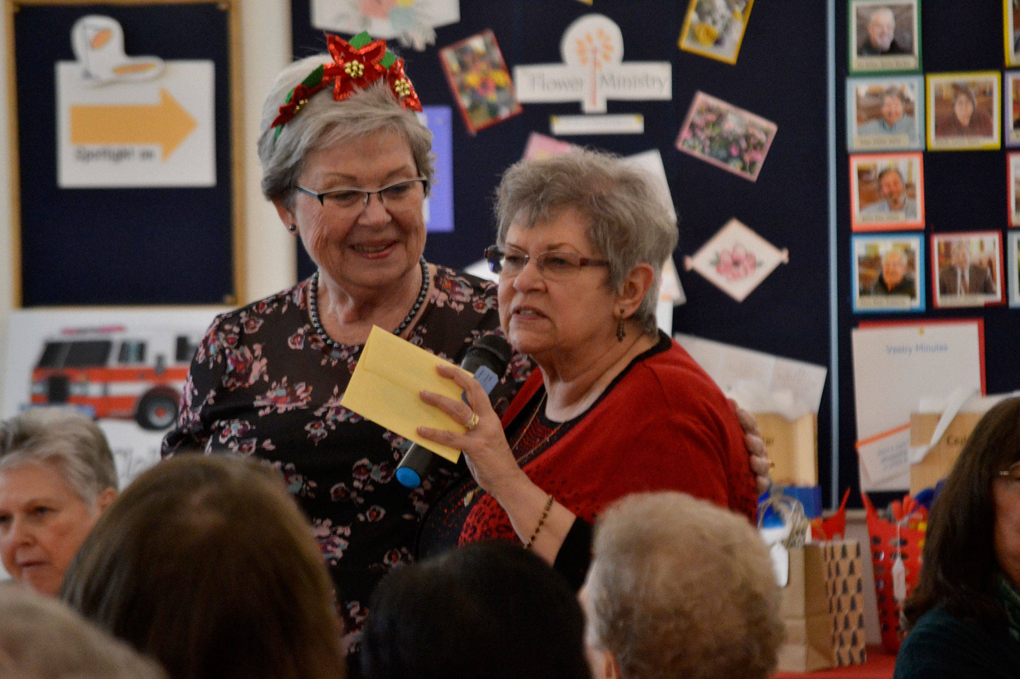 Nancy McGovern, president of the Sequim-Dungeness Hospital Guild, on left, honors Randi Cooper, thrift shop chairman of donations, during the guild’s volunteer luncheon on Dec. 12 in St. Luke’s Episcopal Church. Cooper said part of her job is checking items and prices. Sequim Gazette photo by Matthew Nash