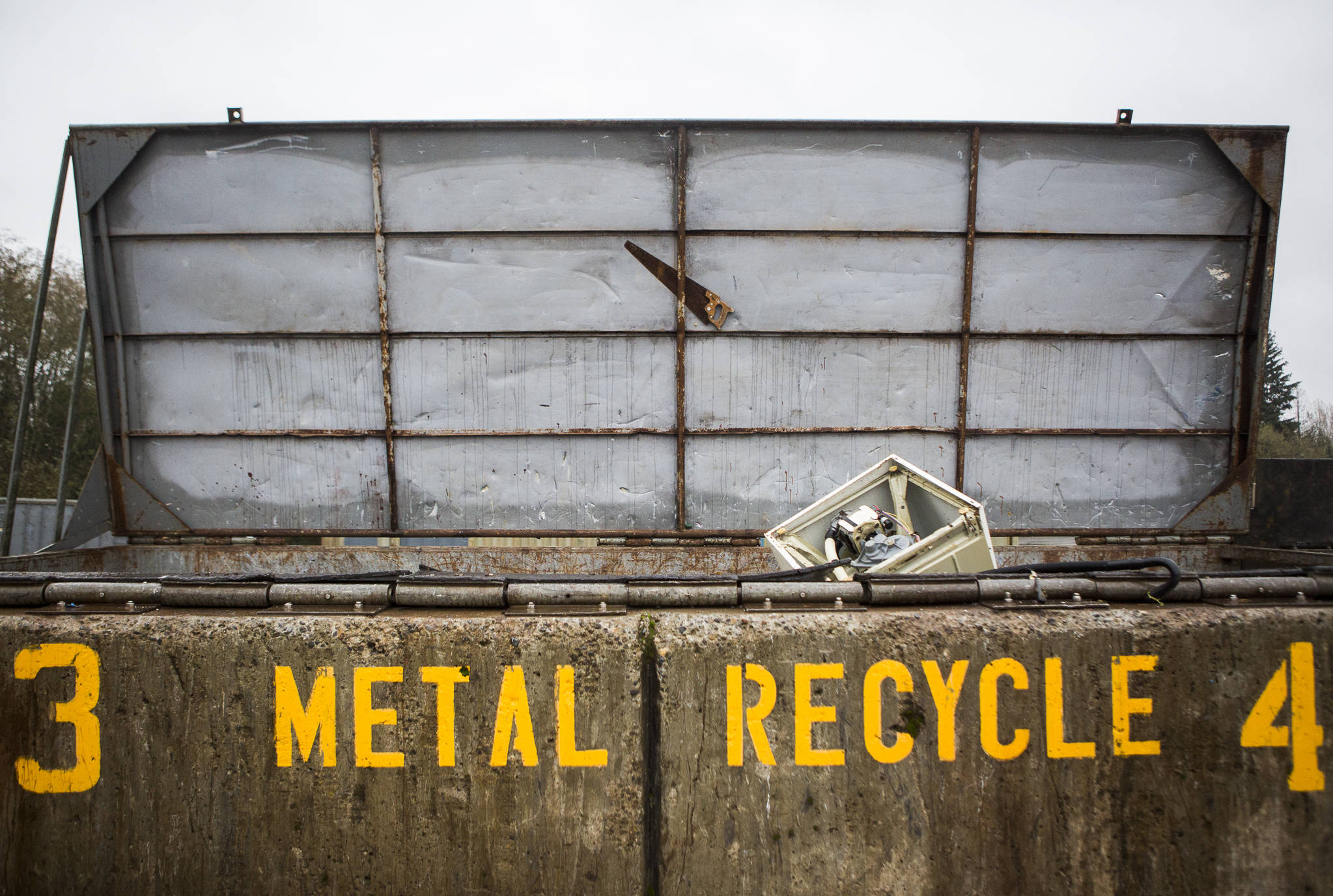 Metal appliances and other metal items fill a recycling container at the Airport Road Recycling & Transfer Station on Nov. 24 in Everett. Photo by Olivia Vanni/The Herald (Everett)