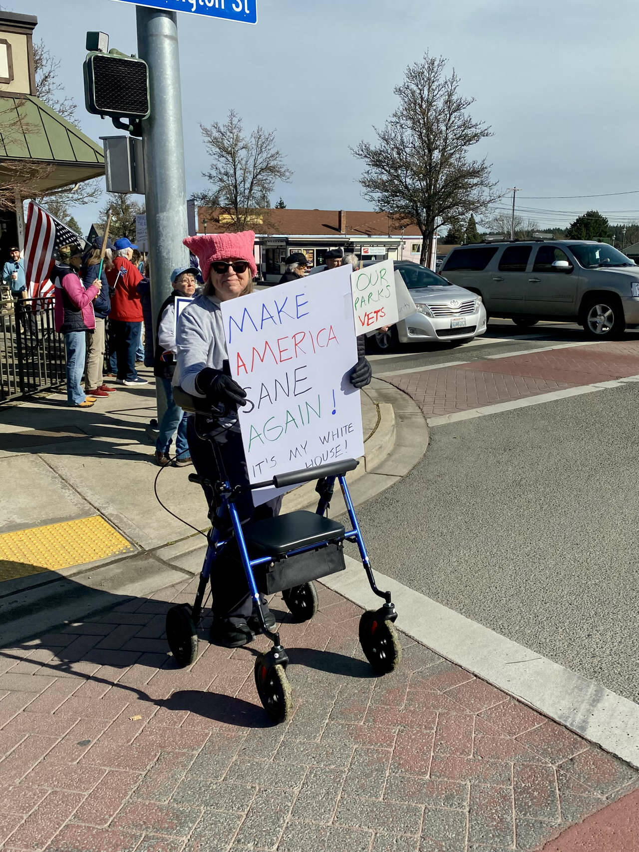 About 50 people, many holding signs, gathered at Sequim Avenue and Washington Street around lunchtime Friday to protest against President Donald Trump and his administration.