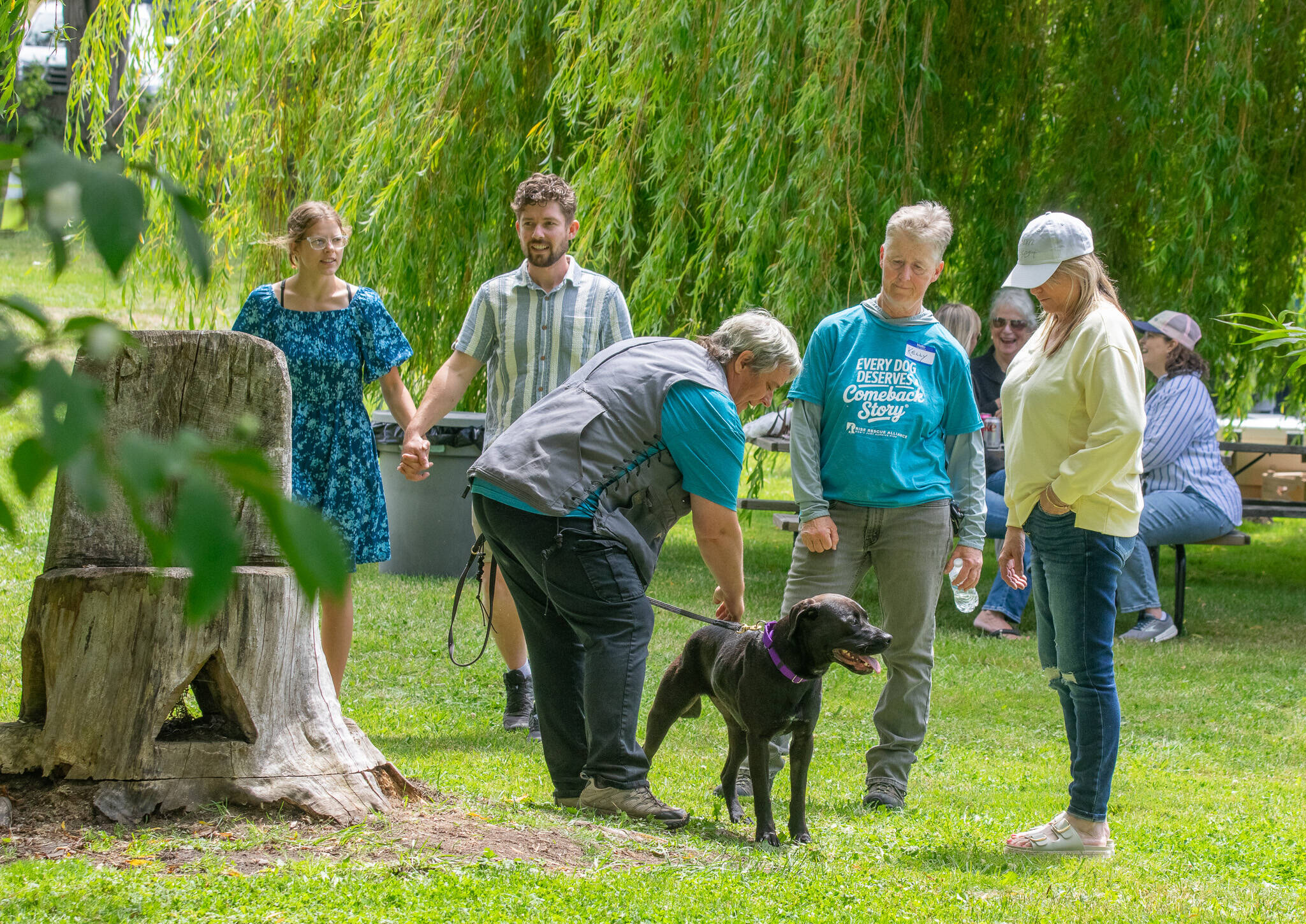 Sequim Gazete photo by Emily Matthiessen/ Rise Rescue Alliance volunteer Polly Norton pets Bonnie, a pit bull mix who came to the n0n-profit dog training rescue after the death of her owner. Volunteer Kelly Thomas stands to her right, then Sandy Caudill.