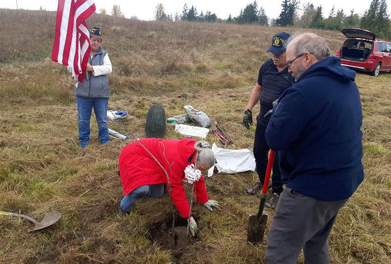 Standing about 4 feet tall, the resilient clone was gifted to Sequim VFW Post #4760 in May and was planted on Thursday, Oct. 30 at the 45-acre memorial park. Those present for the ceremonial planting included Nancy Zimmerman, chaplain, Michael Trebert DAR and commander, American Legion Post #62; Kevin O’Neill, commander, Sequim VFW Post #4760; John Kowalski, senior vice president, Sequim VFW; and Gary Butler of the city’s Parks Department.
