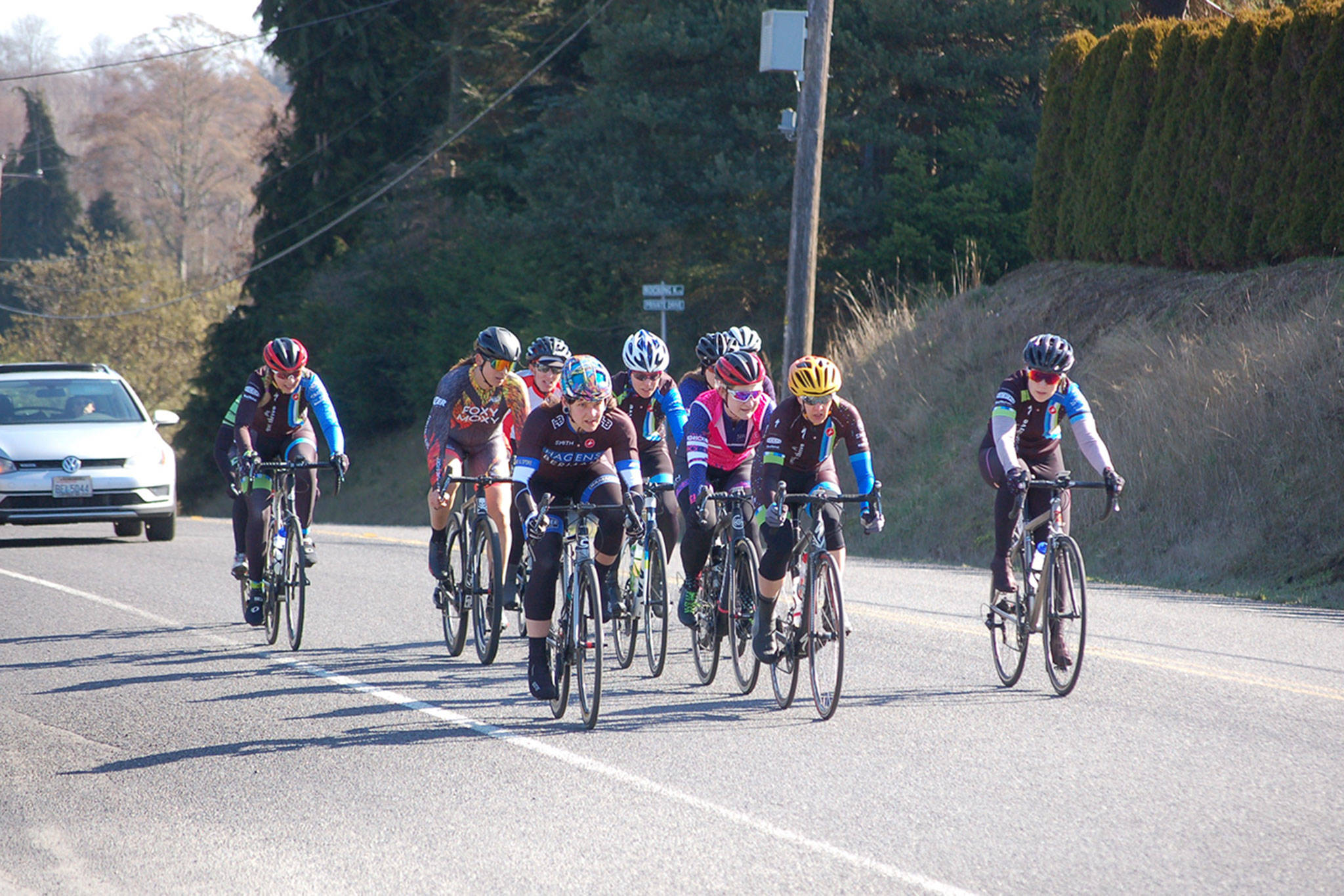 Women’s category 4/5 of the Tour de Dungeness start their trek up Woodcock Road on the morning of March 10. Sequim Gazette photo by Erin Hawkins
