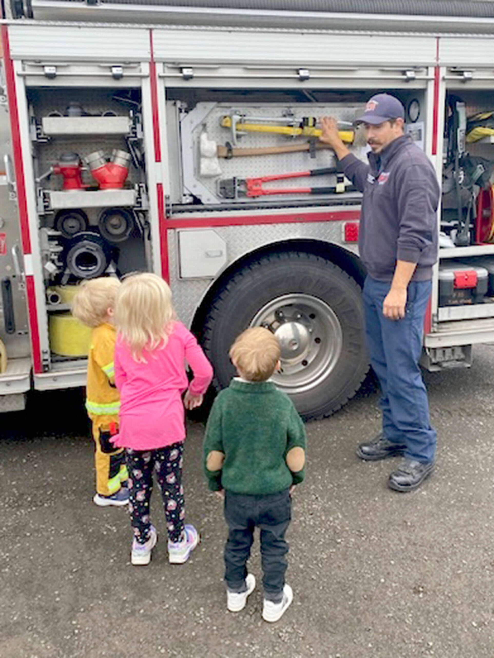 Photo courtesy Clallam County Fire District 3 Firefighter/EMT Jon Donahue shows some preschoolers the tools on a fire engine during a recent fire station tour. Check out ambulances, fire trucks, fire hoses and more at the Public Safety and Information Fair on Nov. 4 in Carrie Blake Community Park.