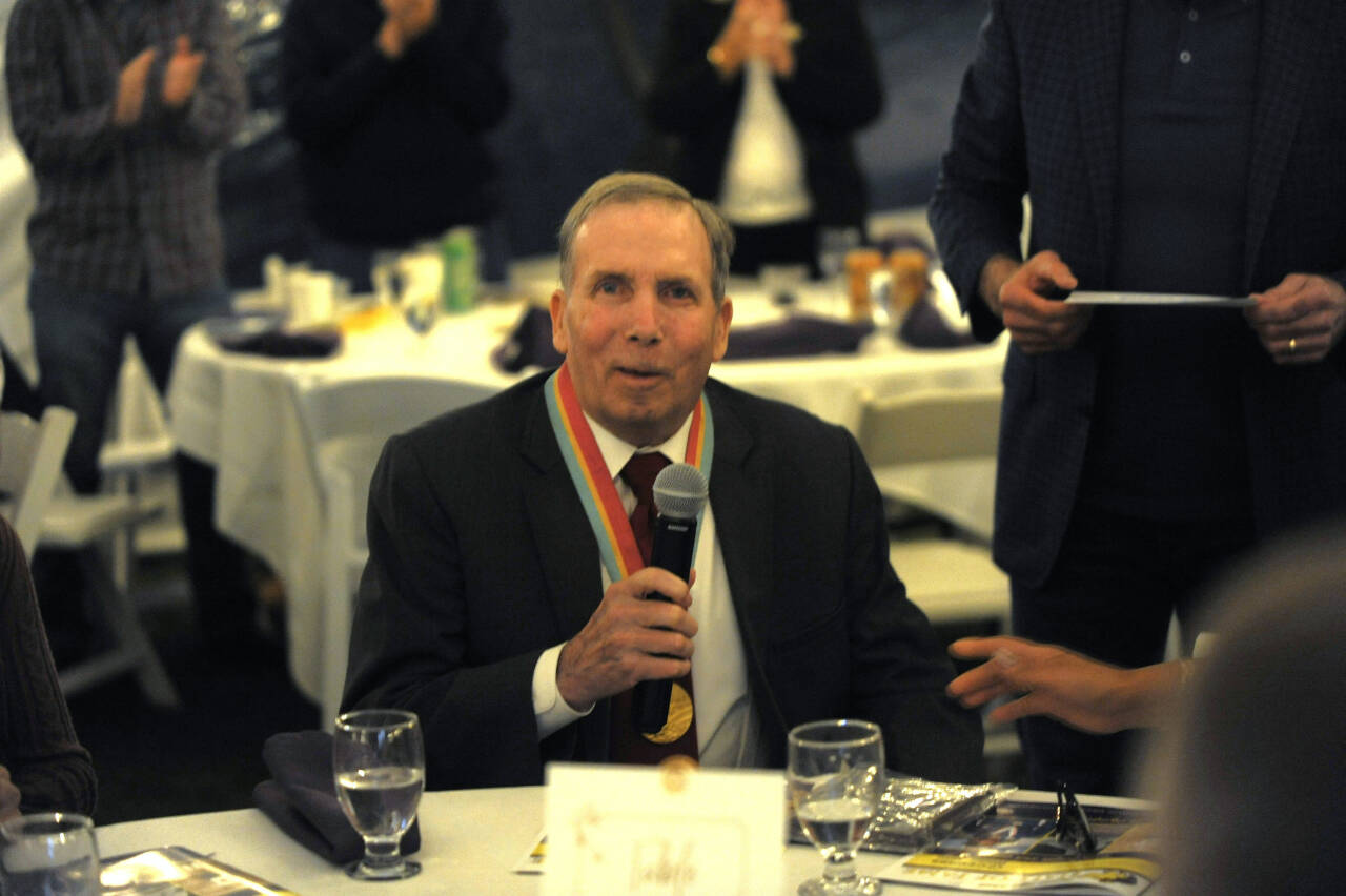 His daughter, Melinda Lehman Dewey, accepted the award on his behalf, recounting the time her father helped spearhead an effort in the mid-1970s to raised money to fund all Sequim schools sports and extracurricular activities that would have been cut that year due to levy failures.