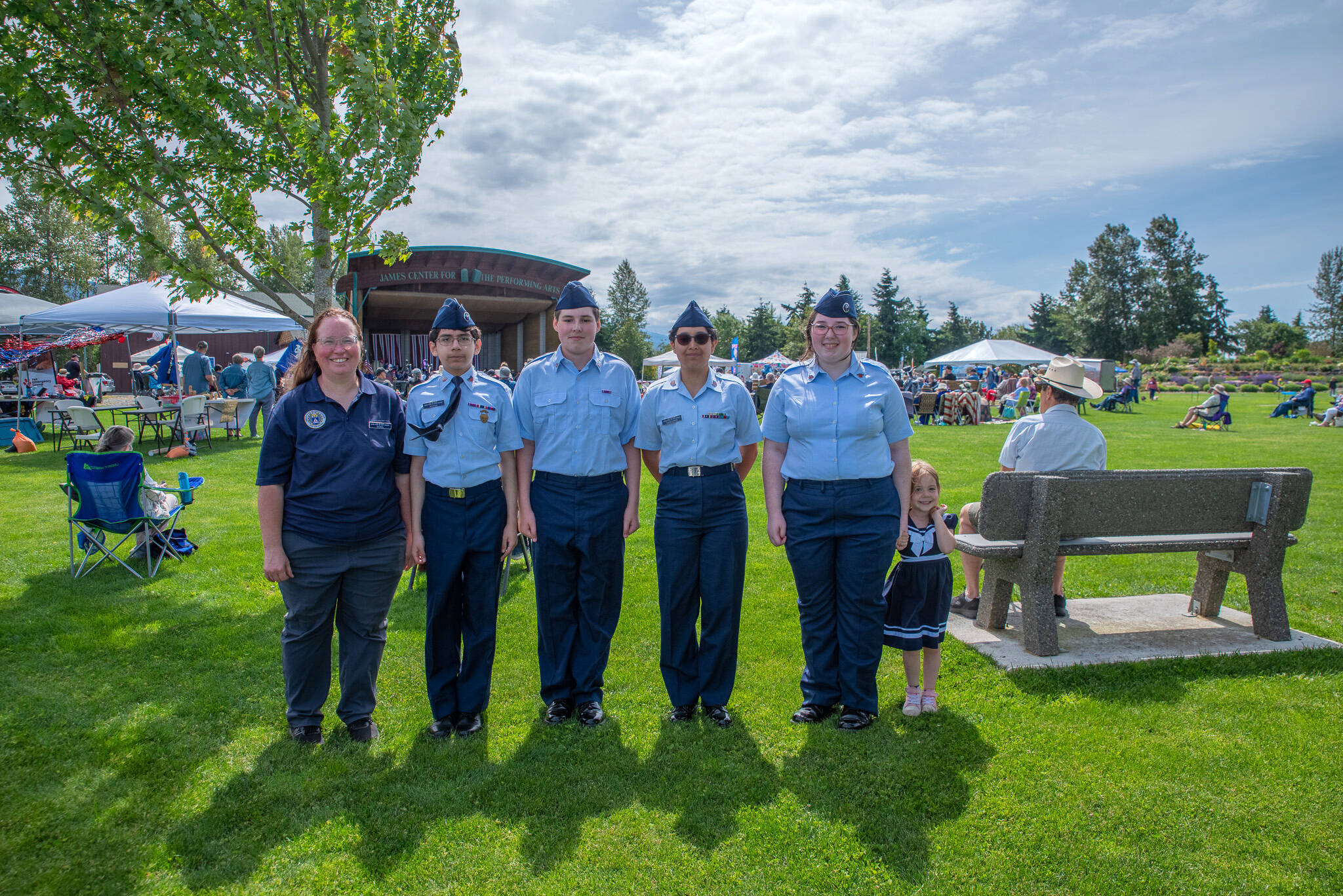 Sequim Gazette photo by Emily Matthiessen/The Dungeness Composite Squadron of the Civil Air Patrol was the color guard at the opening ceremony for the Independence Day celebration at Carrie Blake Community Park in Sequim on Friday, July 4. Pictured from left, are Elizabeth Nickel, Robert M. Rodoni, Harley Bullington, Alexandra Edgecombe, Piper Bullington and Gwen Evans.