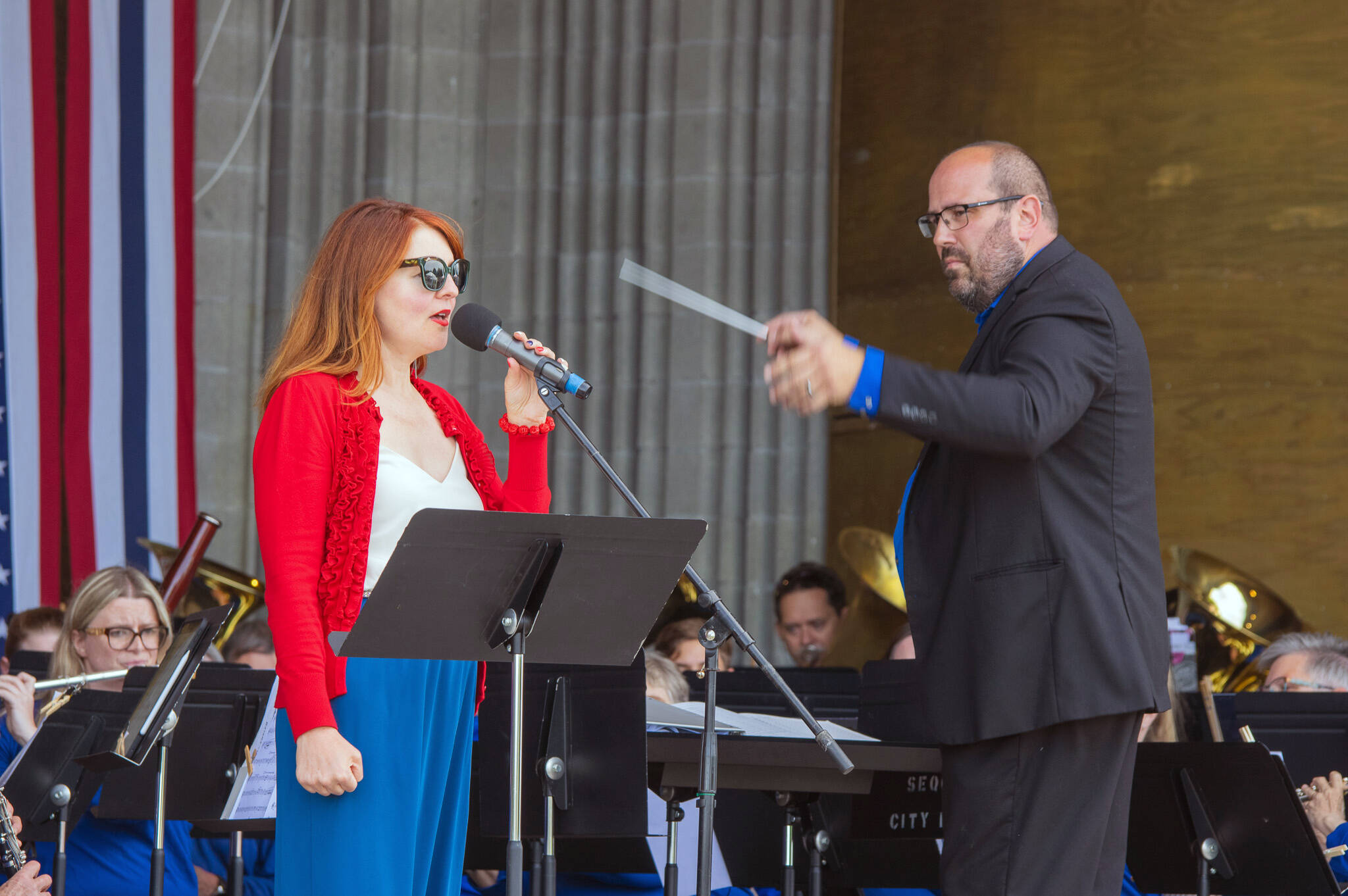 Sequim Gazette photo by Emily Matthiessen/ Sarah Shea sings with the Sequim City Band while Tyler Benedict conducts during the Independence Day celebration at Carrie Blake Community Park.