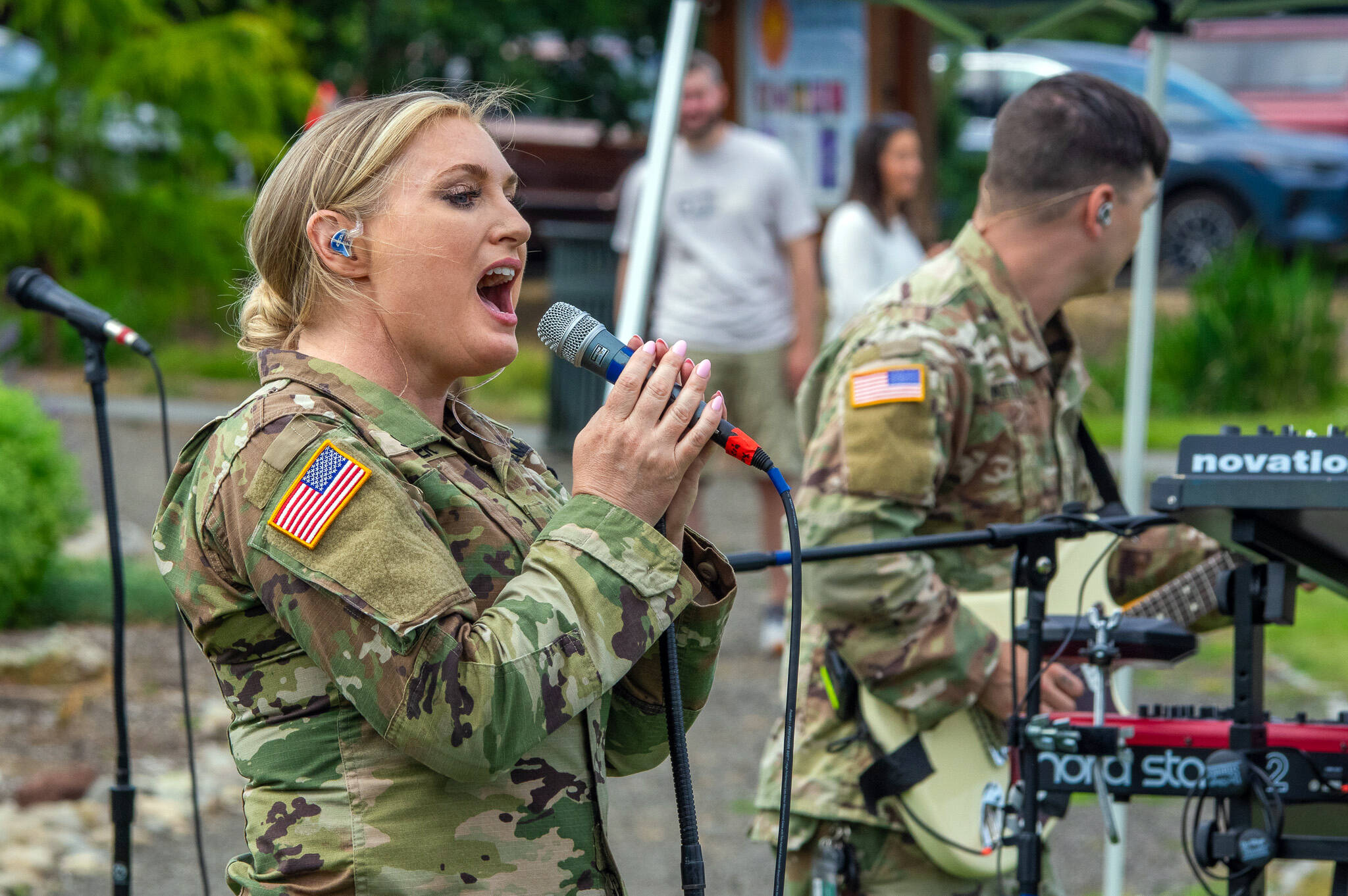 Sequim Gazette photo by Emily Matthiessen/ Tricia Scheer, band leader of the 133d Washington Army National Guard Band from Camp Murray, belts out a rock song on Friday at the City of Sequim’s Independence Day celebration in Carrie Blake Community Park.