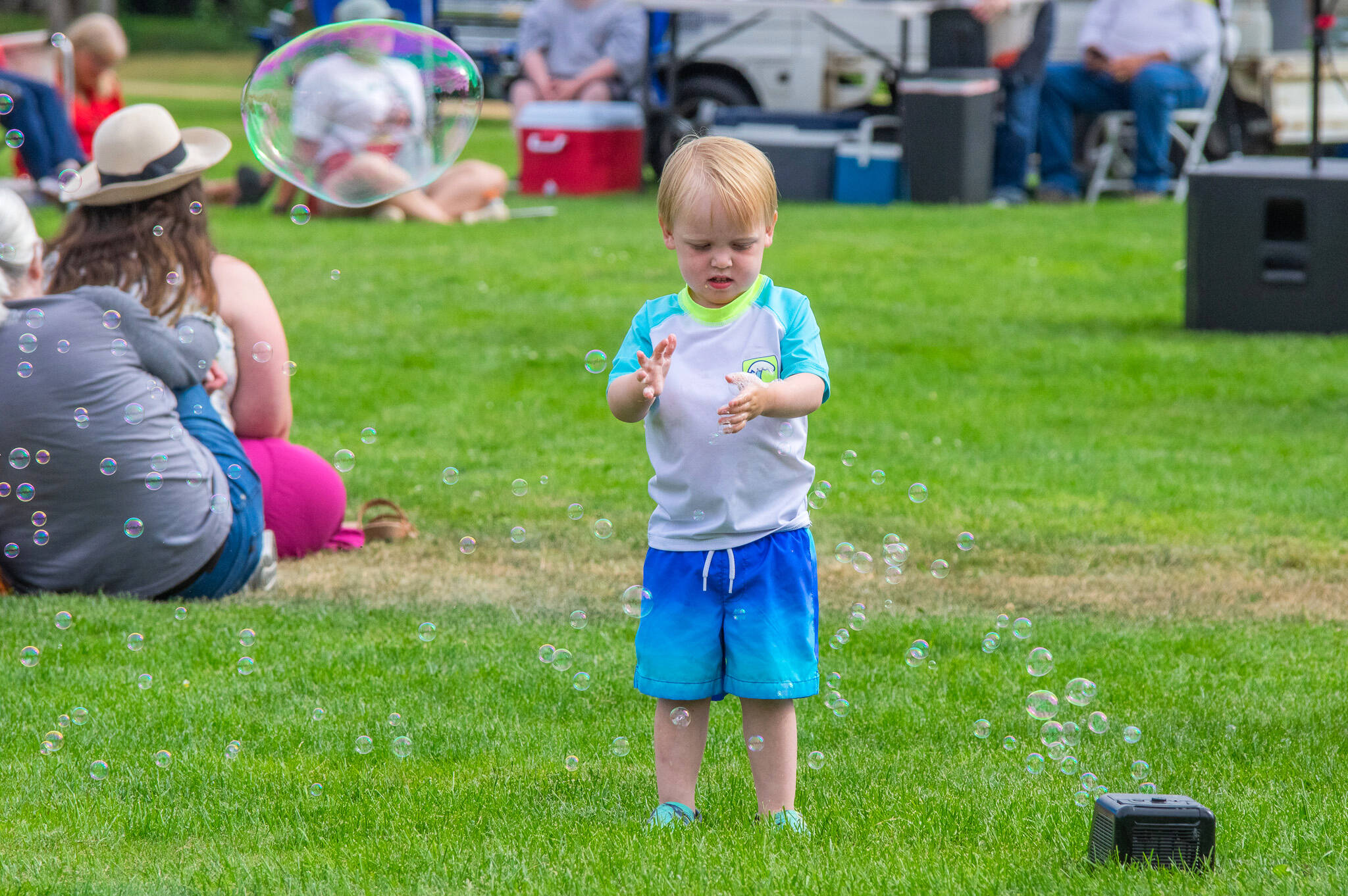 Sequim Gazette photo by Emily Matthiessen/ Maximilian McKnight, 3, of Port Angeles studies bubbles supplied by the City of Sequim at Friday’s Independence Day celebration in Carrie Blake Community Park.