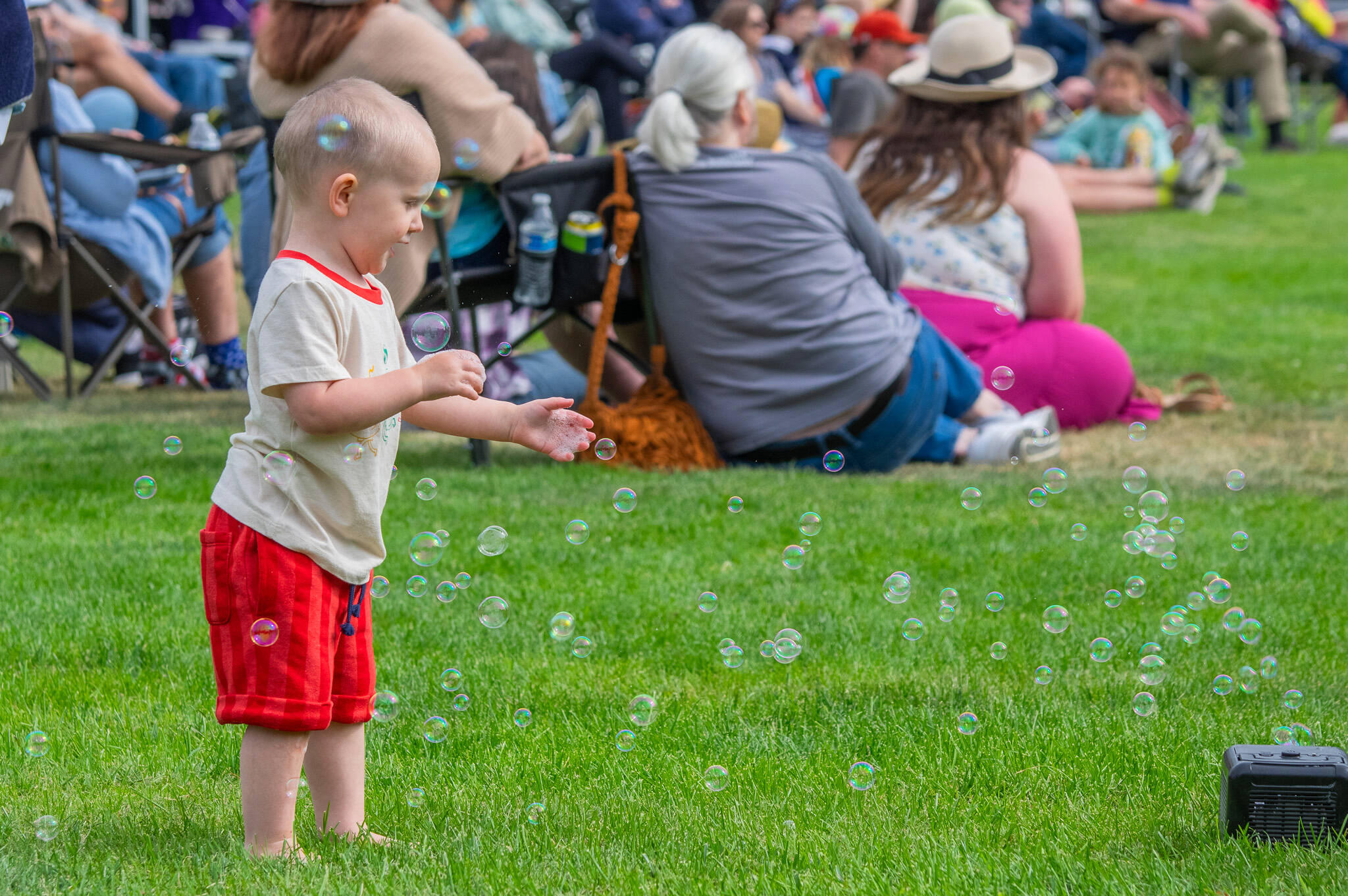 Sequim Gazette photo by Emily Matthiessen/ Milo, 2, of Parkland, was one of many children and adults who appreciated the bubbles supplied by the City of Sequim during Friday’s Independence Day celebration at Carrie Blake Community Park.