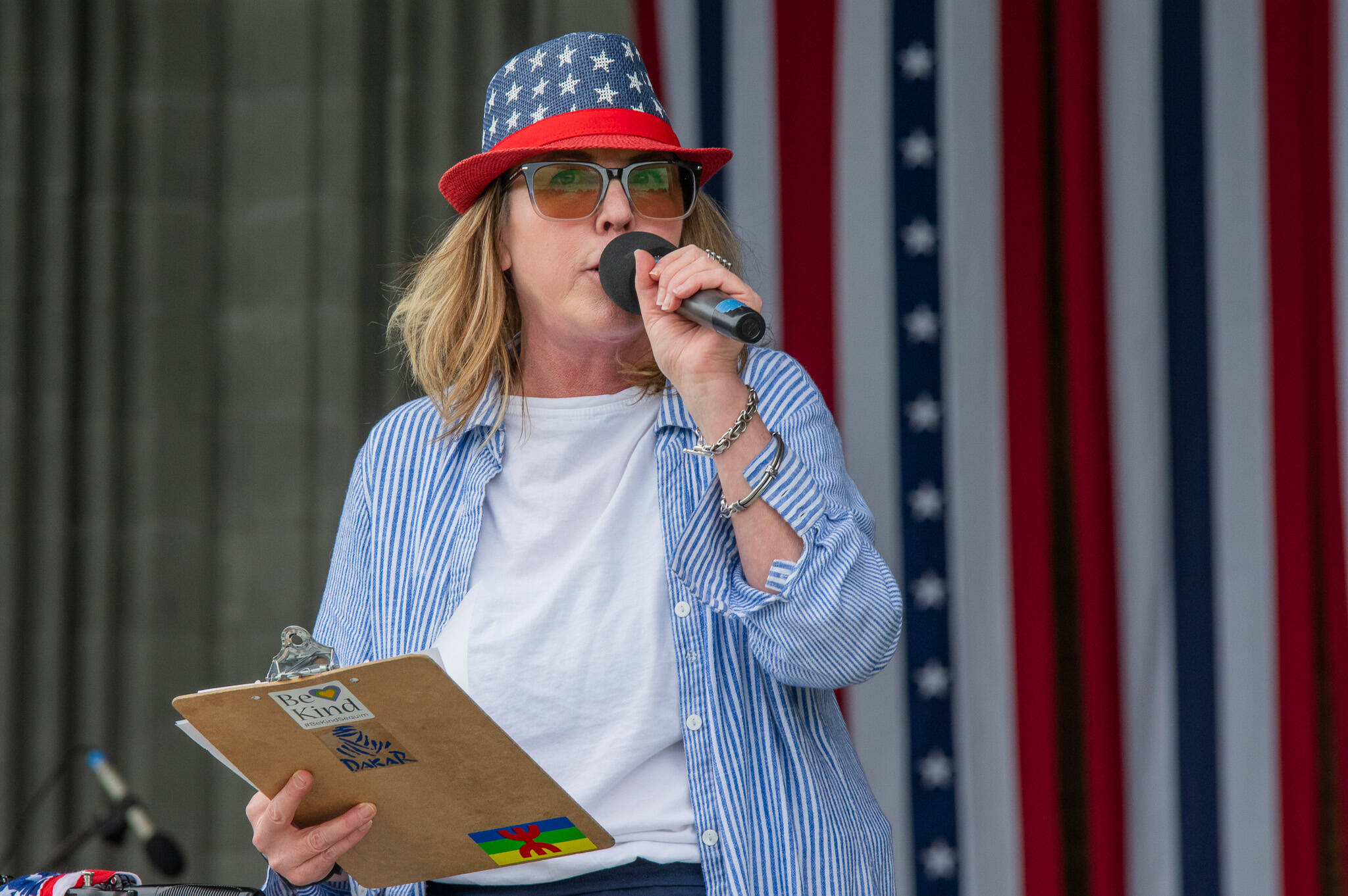 Sequim Gazette photo by Emily Matthiessen/ Brigitte Schlemmer announces during Sequim City’s Independence Day celebration at the James Center Bandshell in Carrie Blake Park Community Park on Friday.
