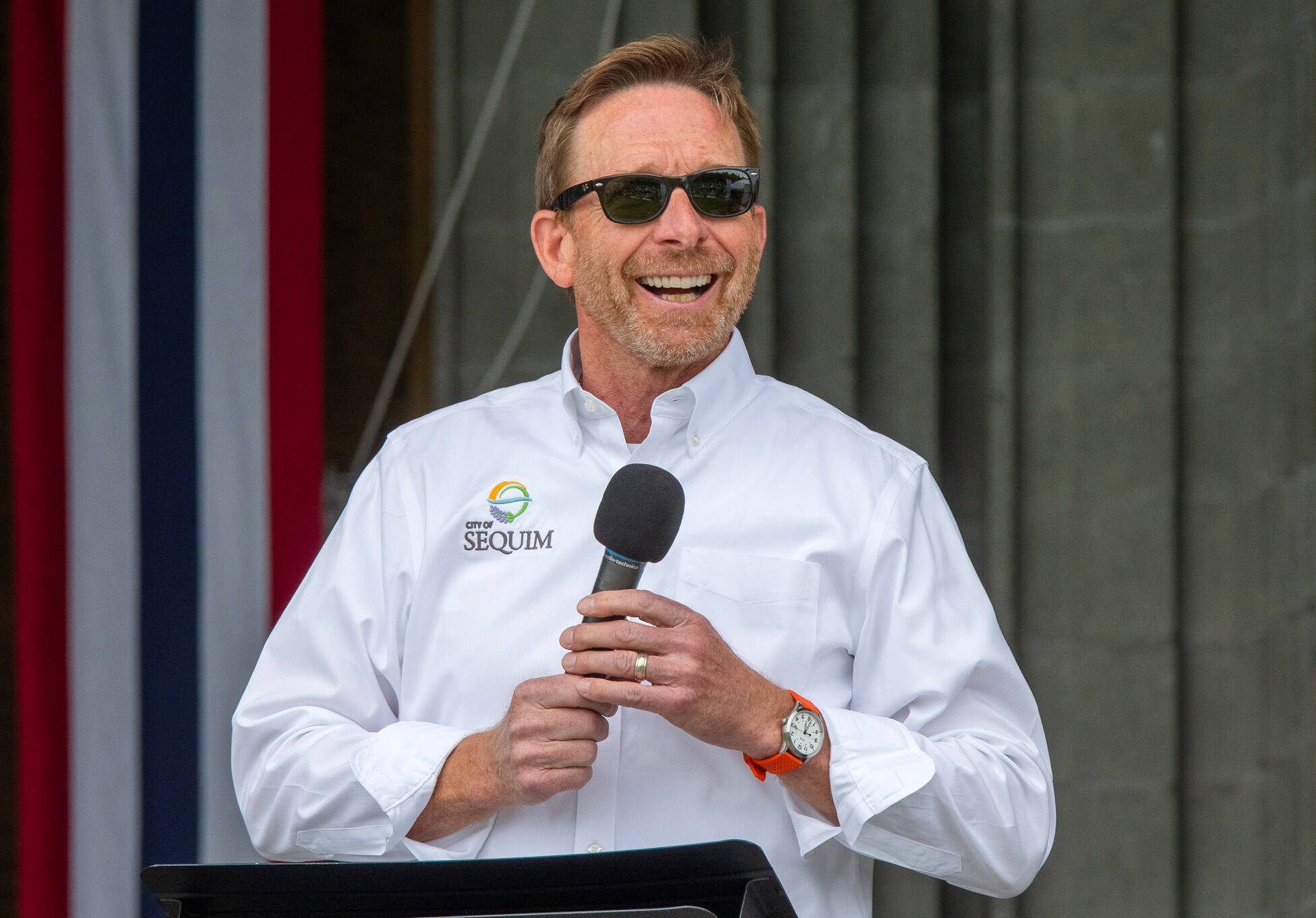 Sequim Gazette photo by Emily Matthiessen/ Sequim City Manager Matt Huish speaks during Sequim City’s Independence Day celebration at the James Center Bandshell in Carrie Blake Community Park on Friday.