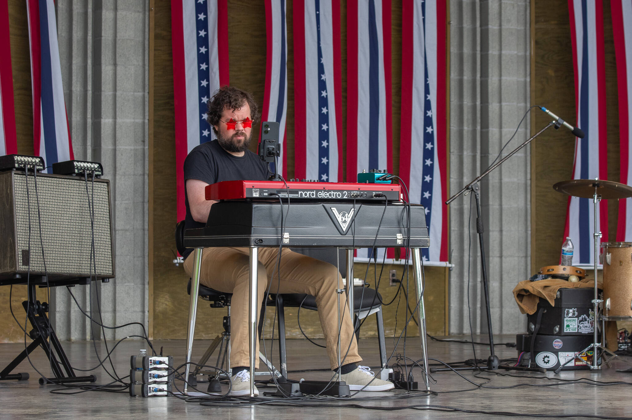 Sequim Gazette photo by Emily Matthiessen/ David Lux plays the keyboard for Casey Freedom at the James Center Bandshell during the Independence Day celebration.