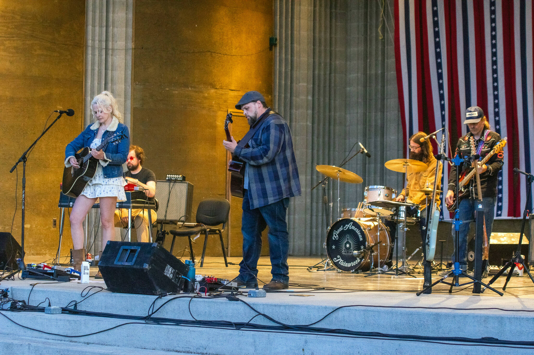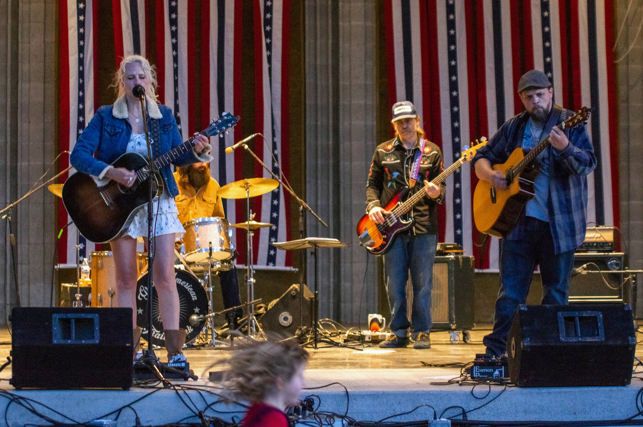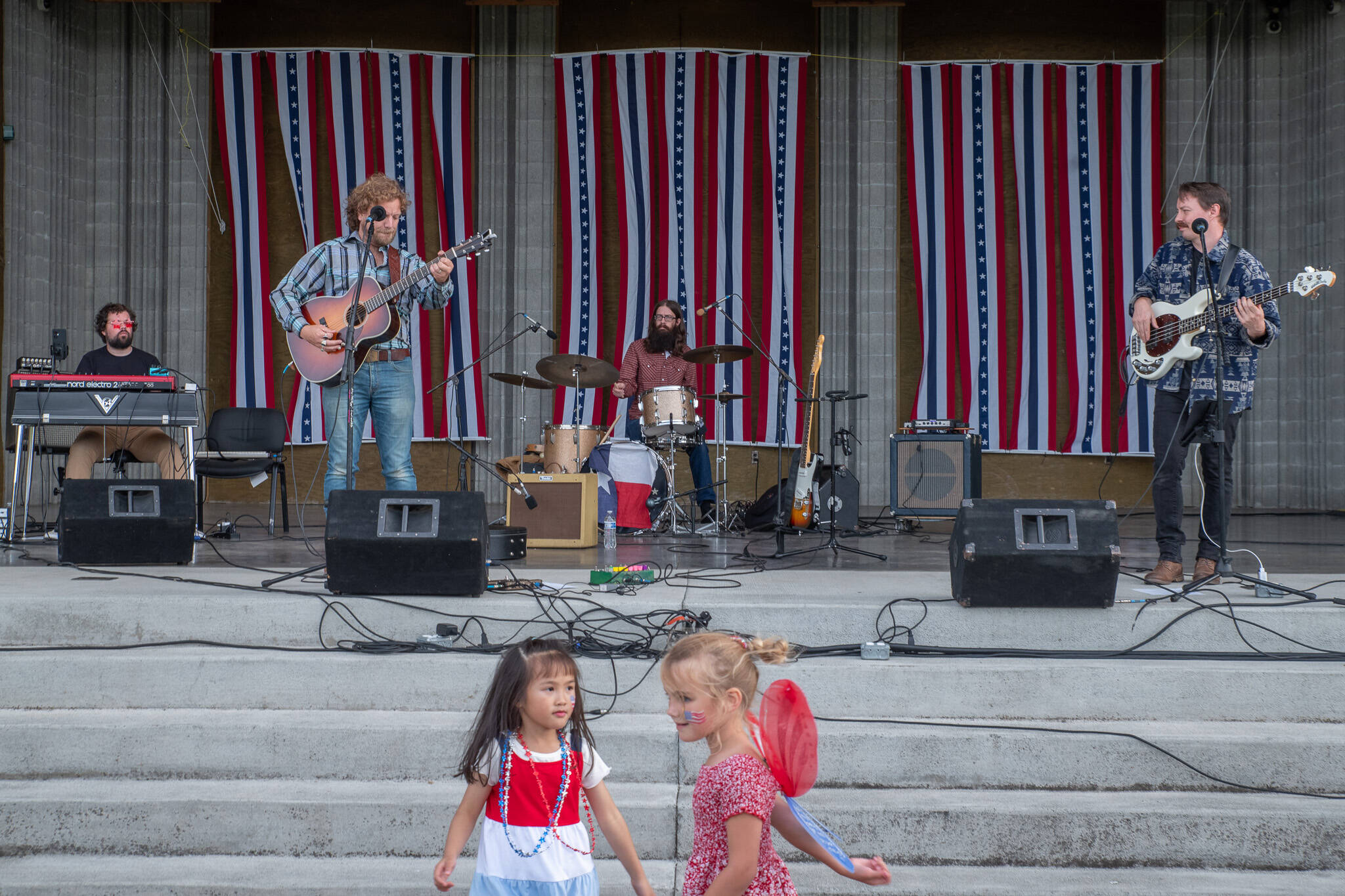 Sequim Gazette photo by Emily Matthiessen/ Great American Trainwreck’s Stephanie Ward, Nick Nordahl, Dave Bush and Joe Cable (and David Lux, not seen) entertain the crowd at Carrie Blake’s James Center Bandshell during the Independence Day celebration.