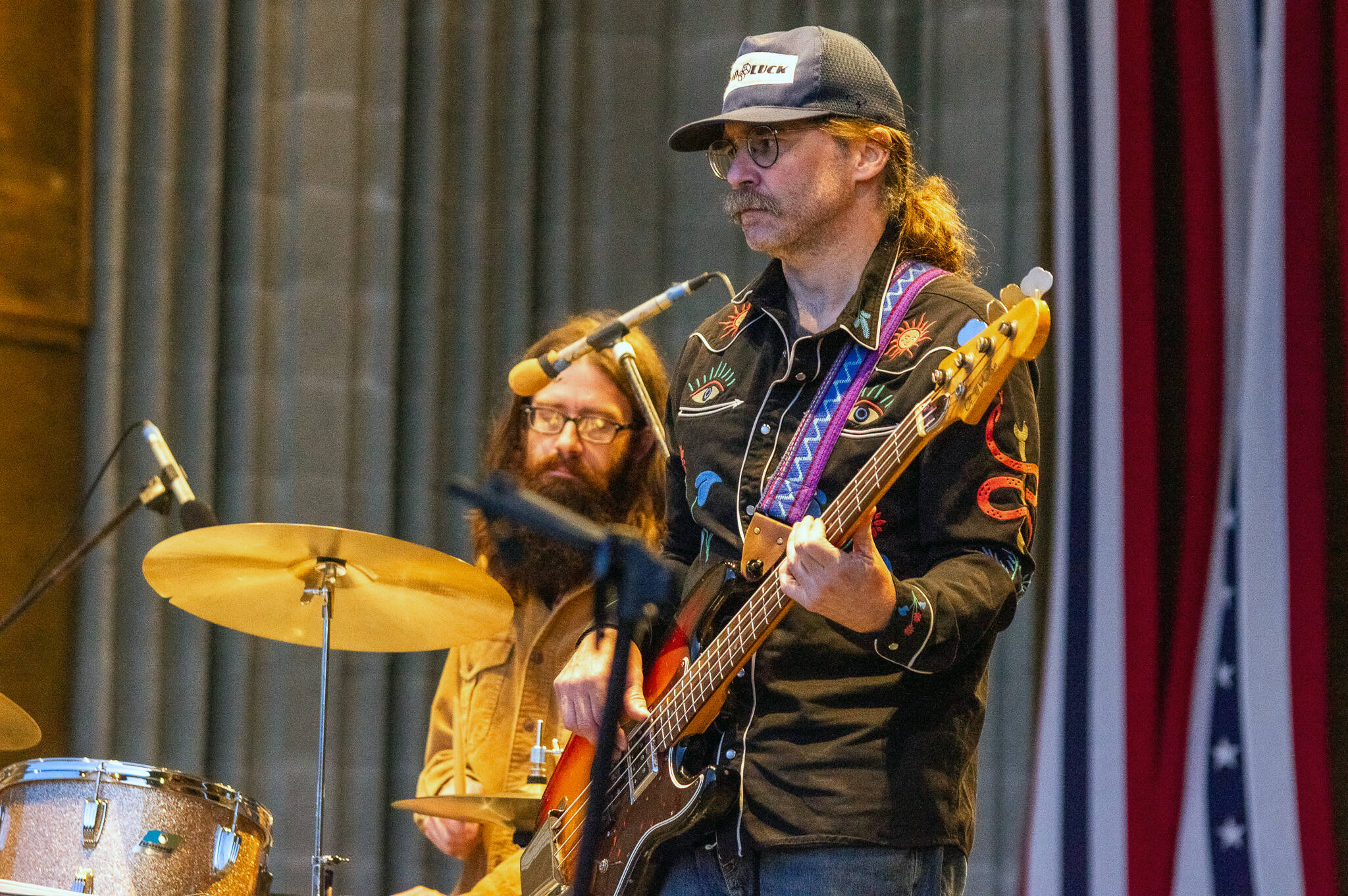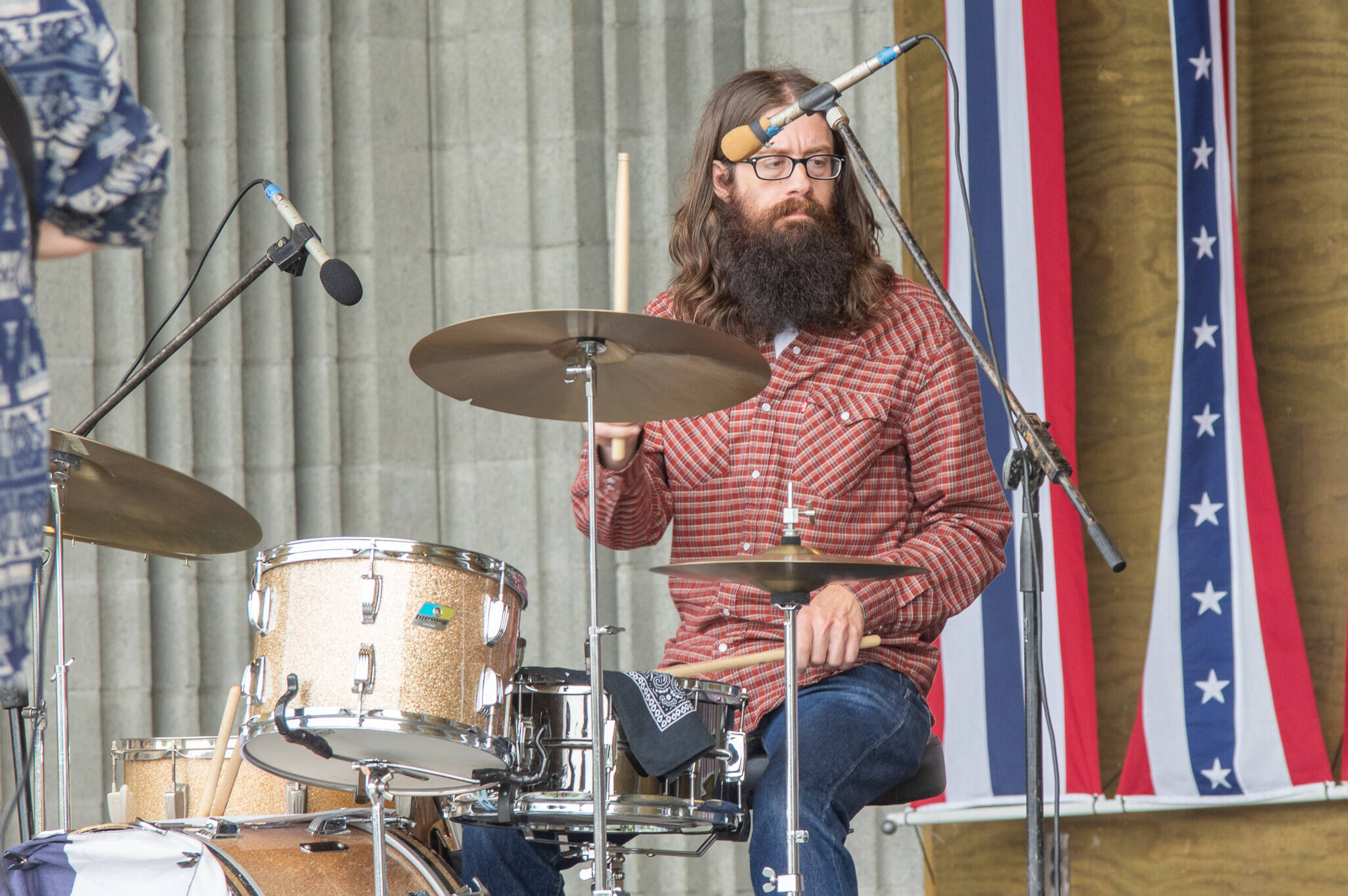 Sequim Gazette photo by Emily Matthiessen/ Dave Bush plays drums for Casey Freedom at the James Center Bandshell during the Independence Day Celebration.