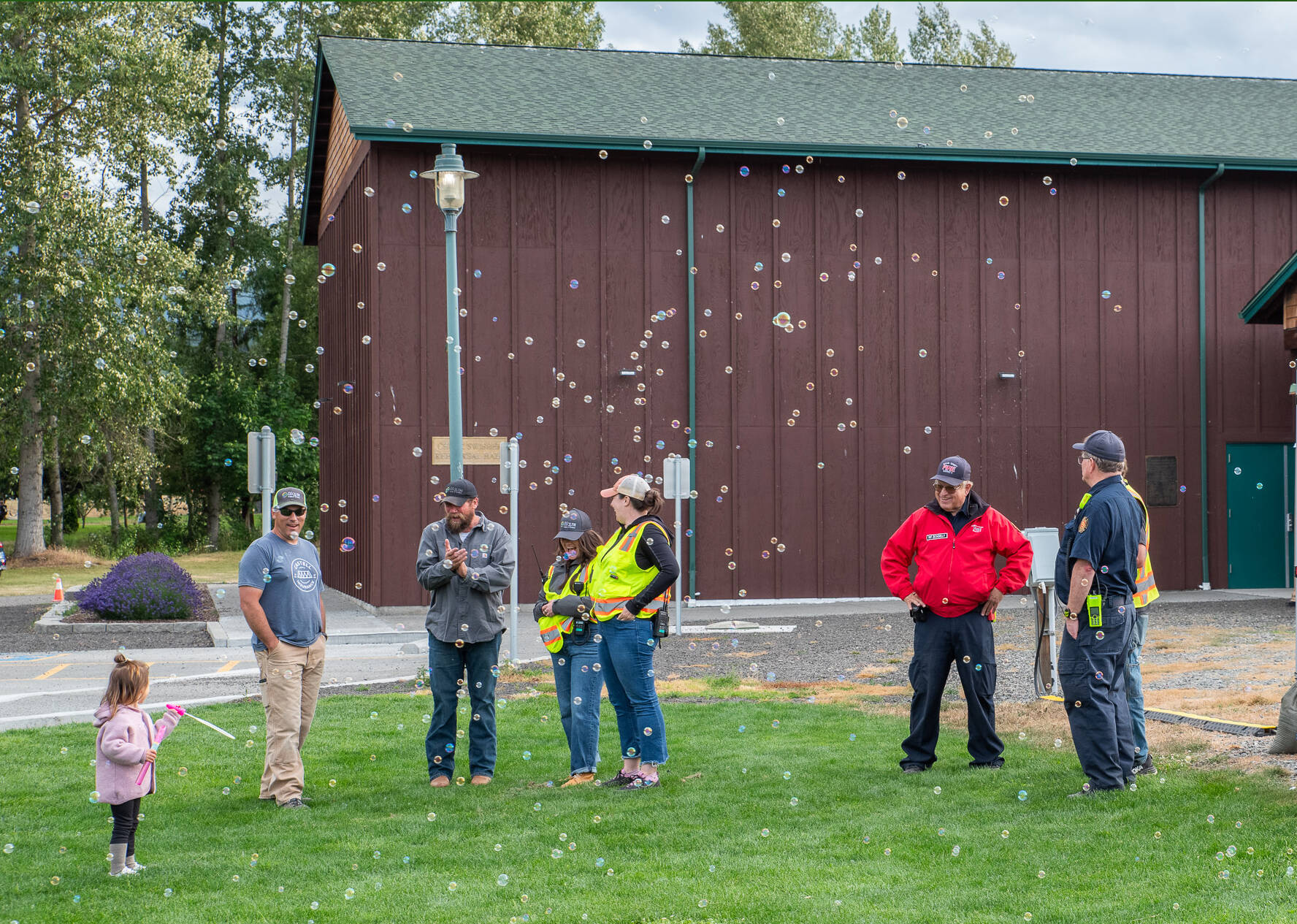 Sequim Gazette photo by Emily Matthiessen/ Sequim City employees provide the magic of bubbles to participants of the Independence Day celebration at Carrie Blake Community Park on Friday.