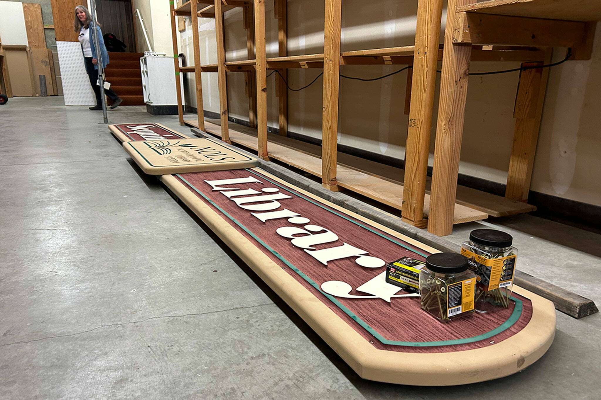 Sequim Gazette photo by Matthew Nash/ The Sequim Library sign is one of the last things to be placed before materials move from the Sequim Avenue library to the temporary space on Washington Street next to the former JCPenney building. The temporary library will be open through expansion and renovation of the existing library.