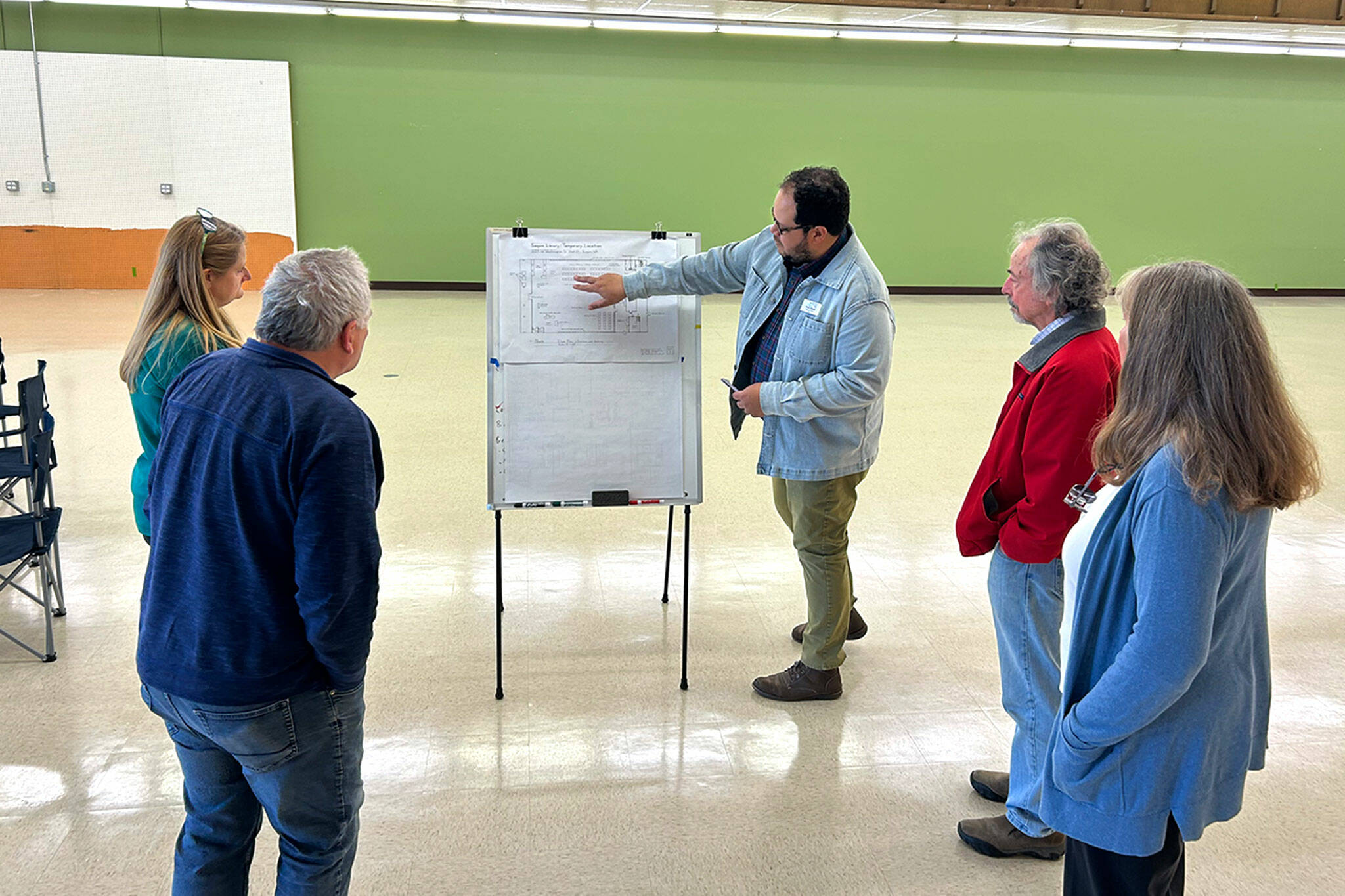 Noah Glaude, NOLS executive director, shows library trustees the floor plan of the temporary Sequim Library at 609 W. Washington St. on March 9. It will open on April 1 after all the current library’s materials and equipment are moved for construction.
