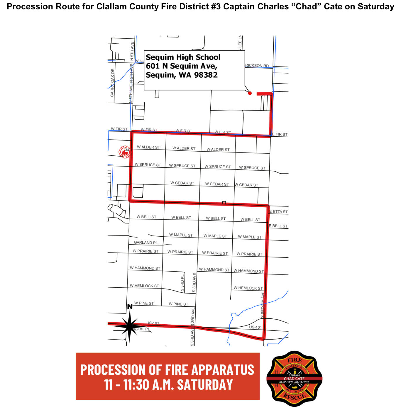 Motorists in the Sequim and Carlsborg areas can expect periodic slowdowns as the memorial procession moves immediately before the service. (To join in the procession of fire apparatus before the memorial, participants must register in advance at tinyurl.com/ChadCateMemorial.)