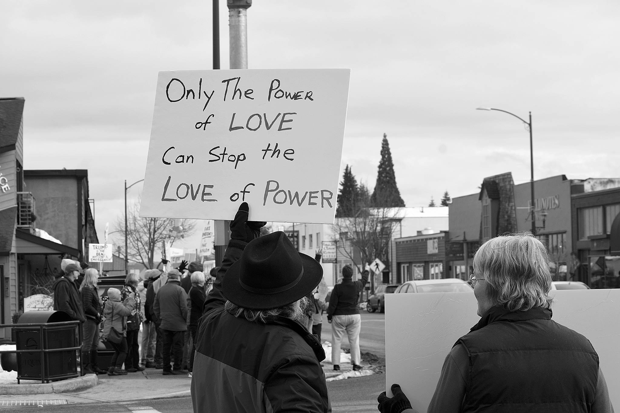 A national protest hosted by MoveOn was held on President’s Day, Feb. 18, with members of Indivisible Sequim joining the opportunity to speak out against the president’s recent declaration by gathering at all four corners of the intersection at Sequim Avenue and Washington Street.