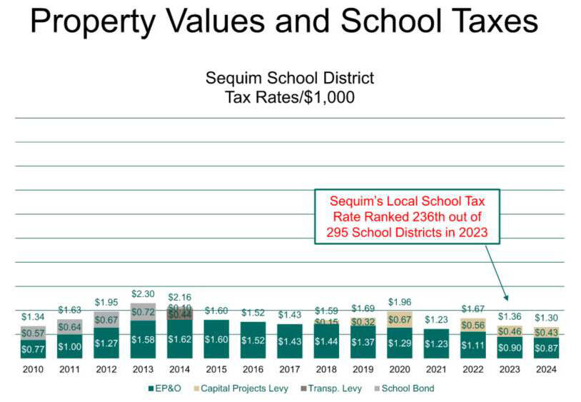 Taxpayers within the Sequim School District boundaries — roughly R Corner to the west, Gardiner to the east and Olympic National Park to the south — currently pay about $1.30 of assessed property value for local schools: $0.87 per $1,000 for a local educational programs and operations (EP&O) levy, and $0.43 in the third of four years of a capital projects levy that ends in 2025.