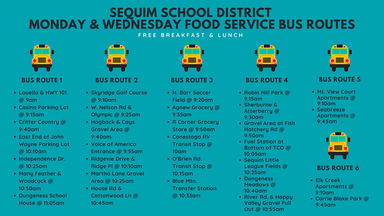 The district also distributes meals via bus routes throughout the district. To find the bus route best fits your family, see the chart below two or visit www.sequimschools.org.