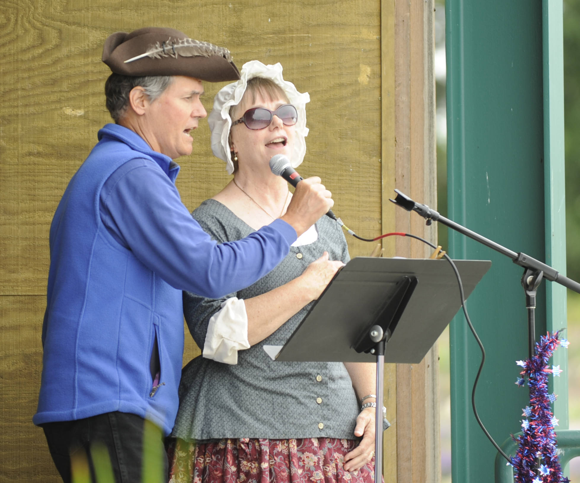 Joel Yelland and Karla Messerschmidt-Morgan help lead the “The Star Spangled Banner,” while the Sequim City Band plays to open the July 4 “A Patriotic Fourth” concert.