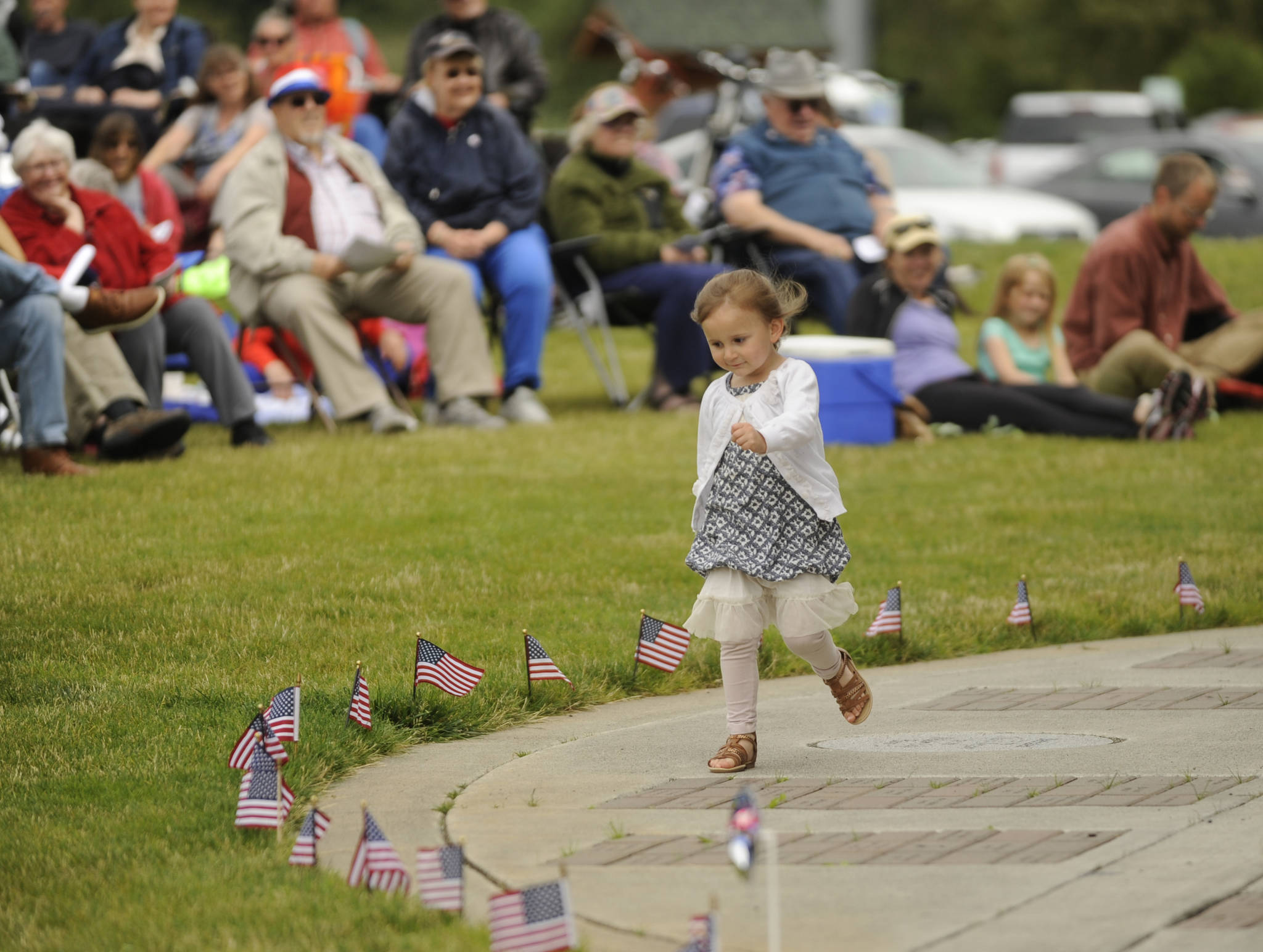 While her father Tyler leads the Sequim City Band at the July 4 “A Patriotic Fourth” concert, 2-year-old Amelia Benedict enjoys a bit of frivolity.