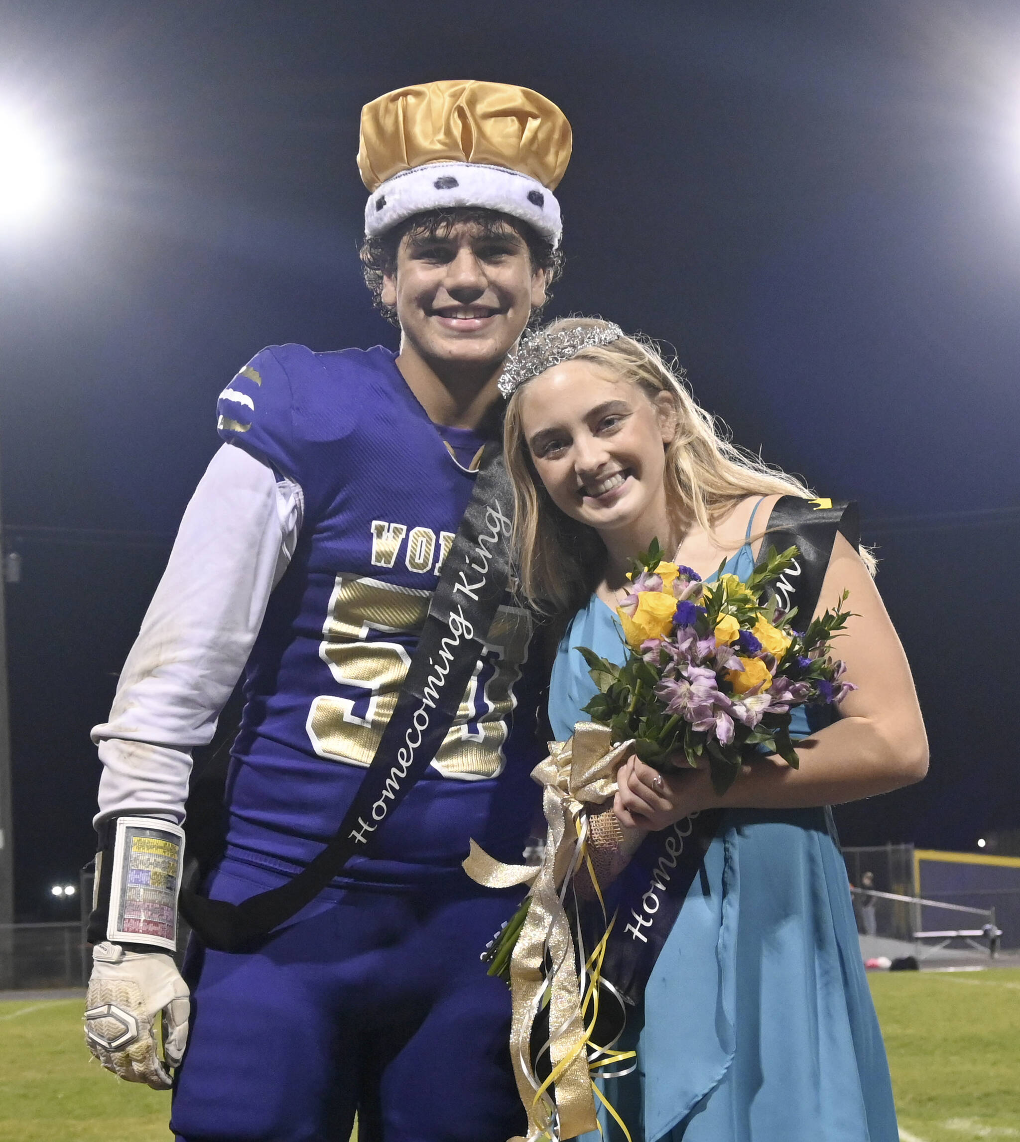 Sequim Gazette photo by Michael Dashiell Sequim High’s Homecoming King and Queen, Pryce Glasser and Alex Schmadeke, smile for the crowd at the Homecoming game halftime festivities Oct. 16.