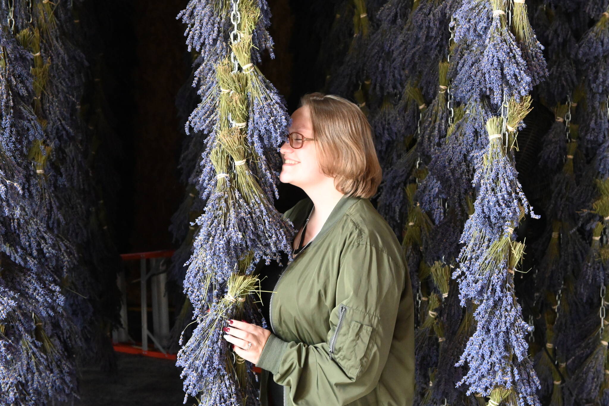 Hailee Williams of Puyallup enjoys the smell of drying lavender at B&B Family Farm in mid-July during Sequim’s 2021 Lavender Weekend. Sequim Gazette photo by Michael Dashiell