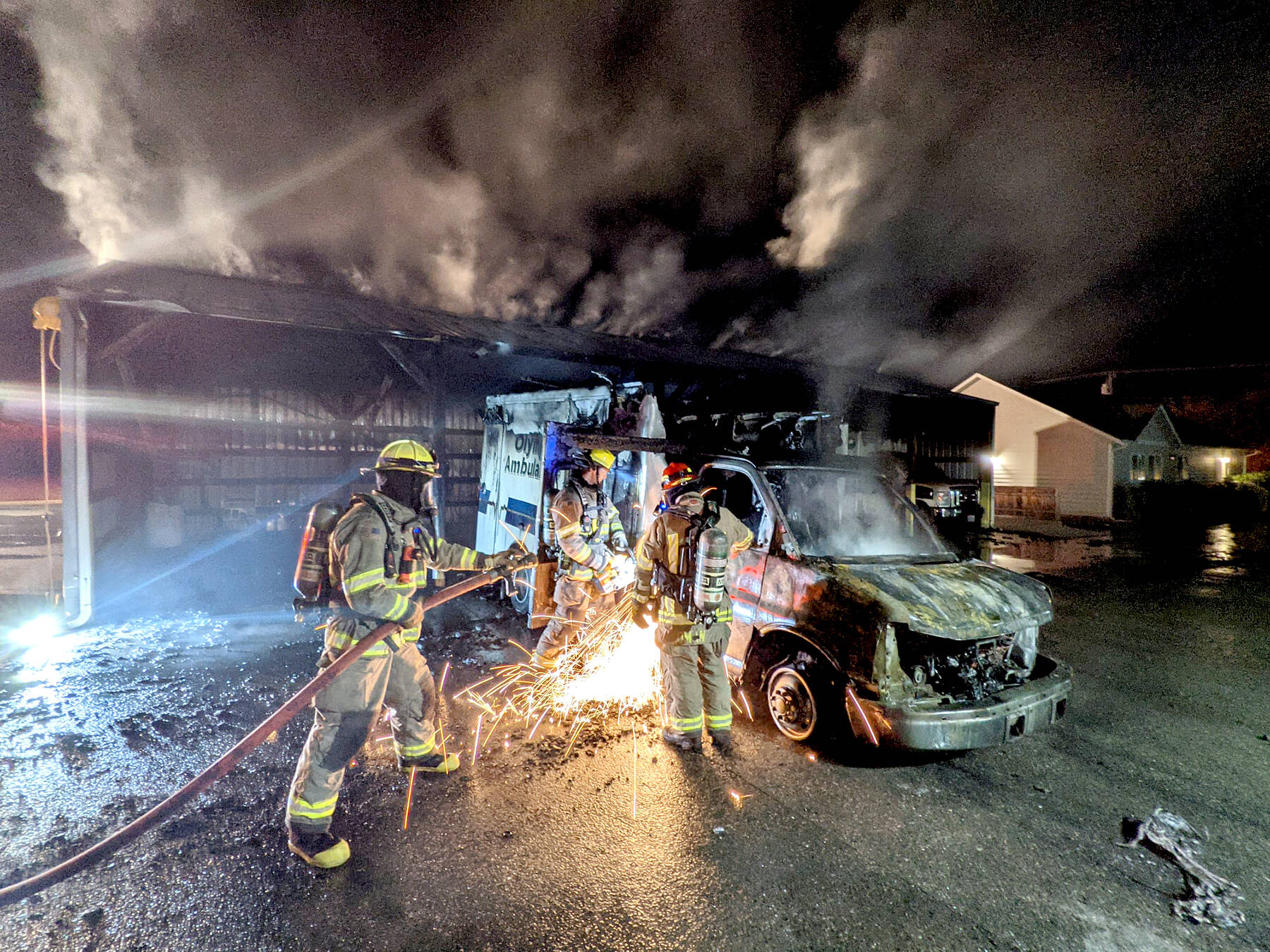 Firefighters respond to an early-morning fire at Olympic Ambulance early on the morning of July 13. Photo courtesy of Clallam County Fire District 3/Facebook
