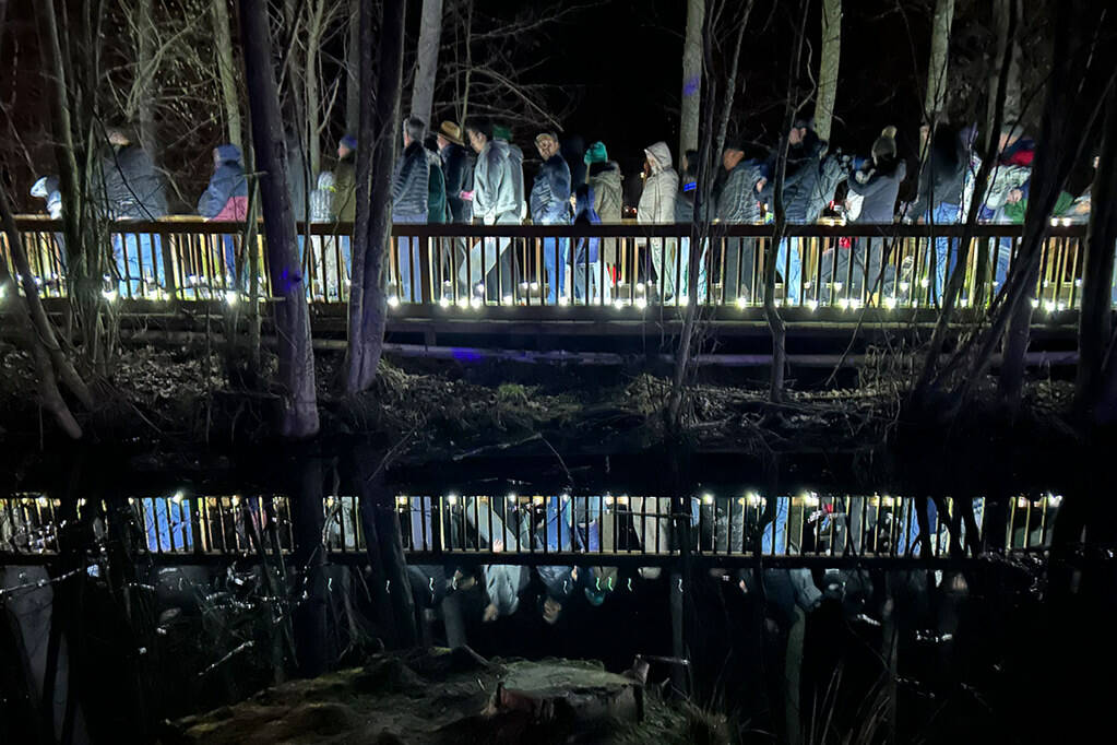 Visitors of the Sequim Sunshine Festival exit Carrie Blake Community Park via bridge after the illuminated drone show in 2024. The drone show returns at 7 p.m. Saturday, March 8 in Carrie Blake Community Park.