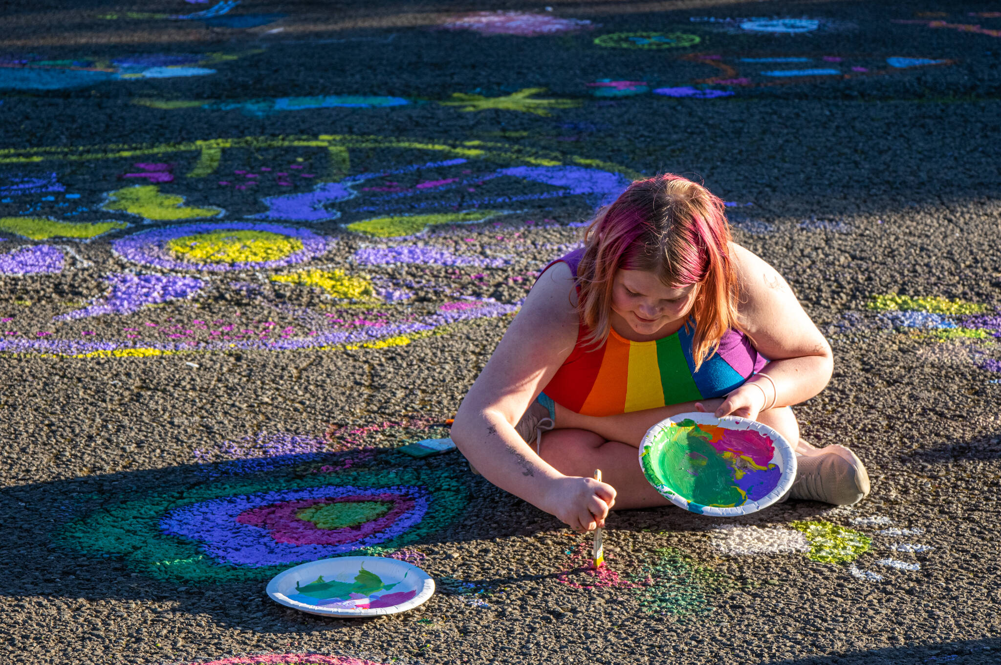 Looking like a rainbow herself, Ruth Korwel, 11, spreads colorful cheer on the asphalt of Carrie Blake Community Park as part of the “Community Art Street Painting Project.”