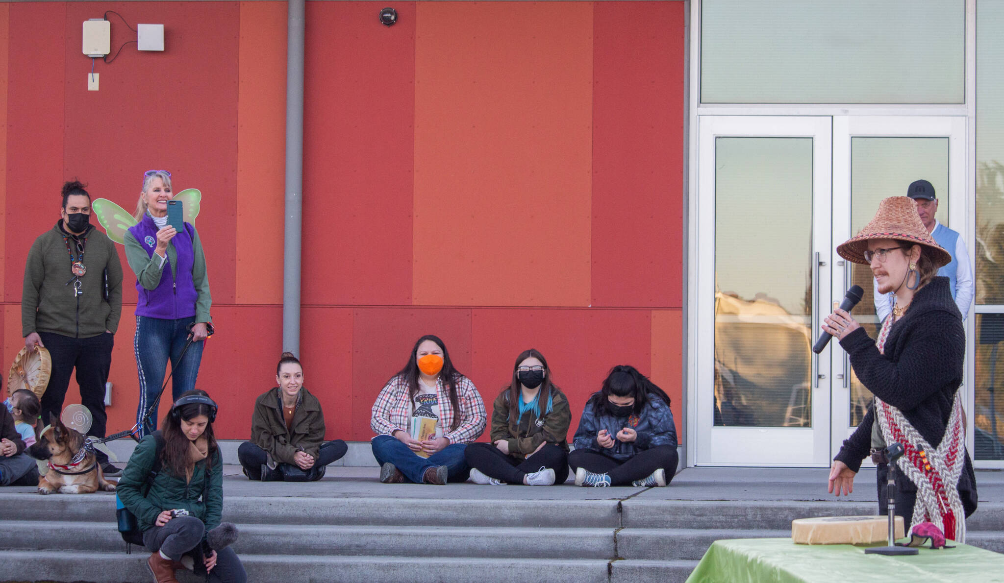 The Jamestown S’Klallam Tribe’s Mackenzie Grinnell explains “Why the Sun Always Shines in Sequim” at the Sequim Civic Center Plaza on March 4, helping kick off the third Sequim Sunshine Festival. Sequim Gazette photo by Emily Matthiessen