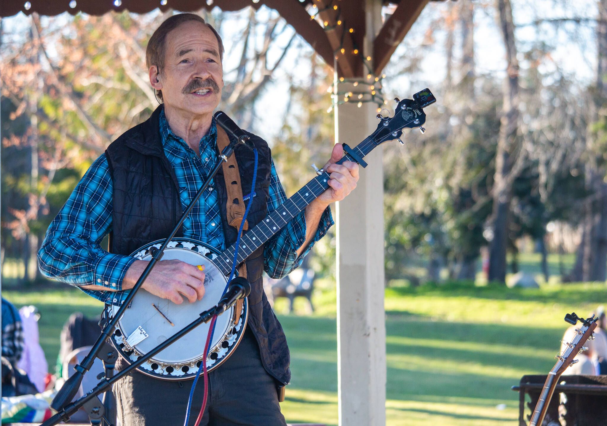 Tom Shindler sings and plays the banjo at the Gazebo in Carrie Blake Community Park for the enjoyment of Sequim Sunshine Festival participants on Saturday afternoon. Shindler played the guitar too, performing a series of sun-related songs for his solo set. Sequim Gazette photo by Emily Matthiessen