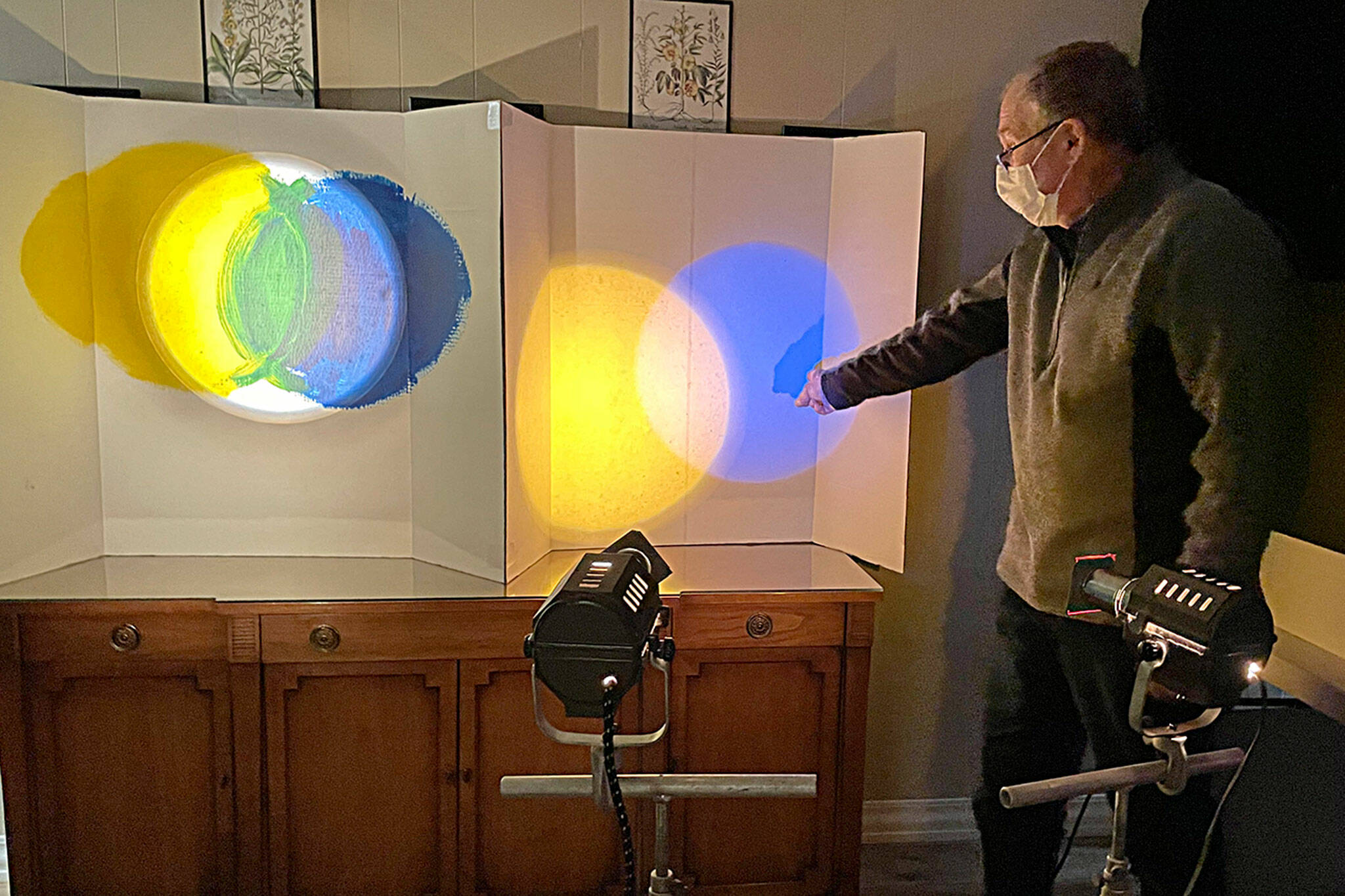 Sequim Gazette photo by Matthew Nash Artist Ross Brown shows in his Interactive Light Experience how light influences additive color mixing, such as with blue and yellow making white rather than green with paint.