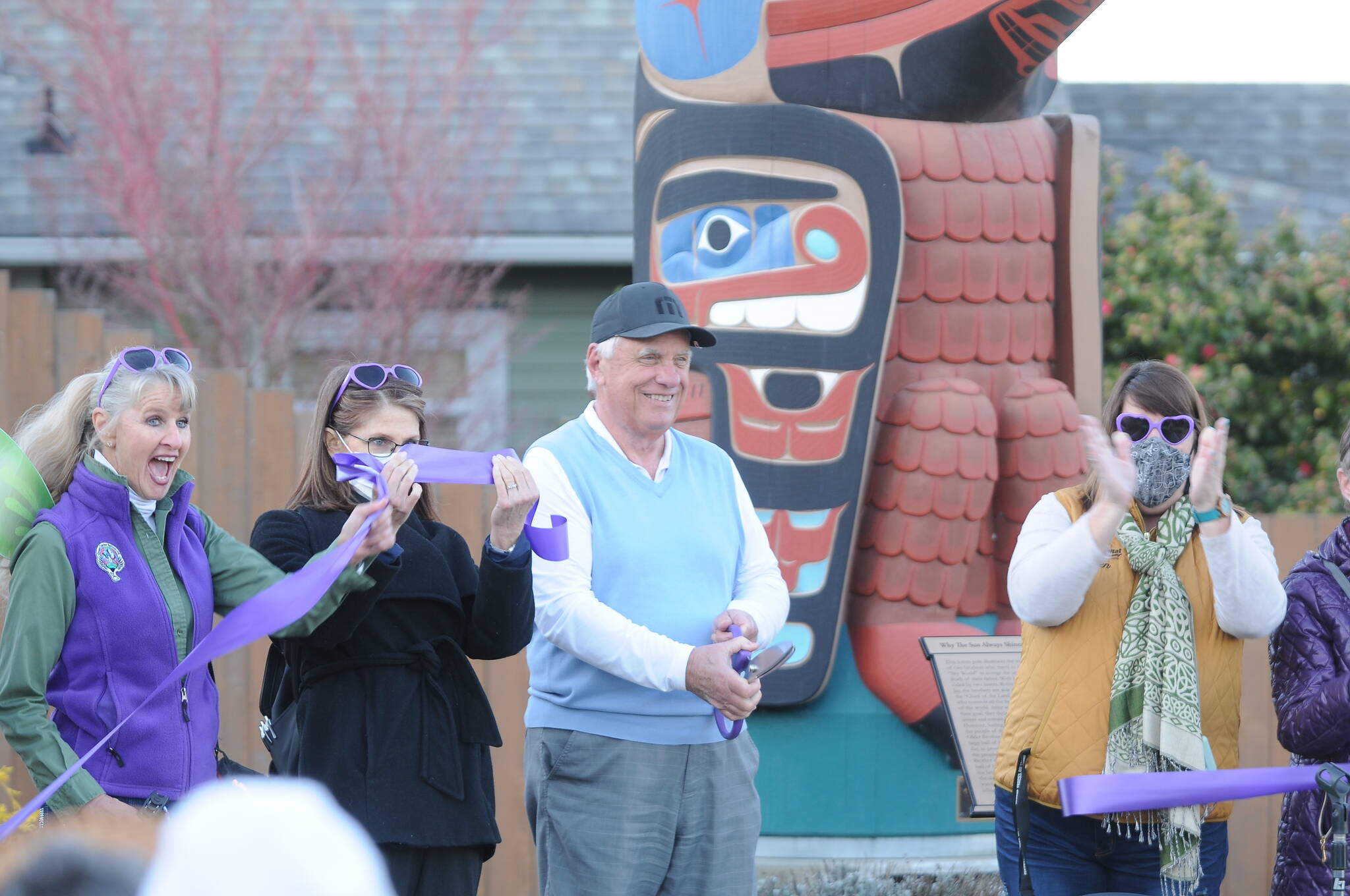 Sequim mayor Tom Farrell cuts the ceremonial ribbon at the Sequim Civic Center Plaza on March 4, helping kick off the third Sequim Sunshine Festival. Sequim Gazette photo by Michael Dashiell
