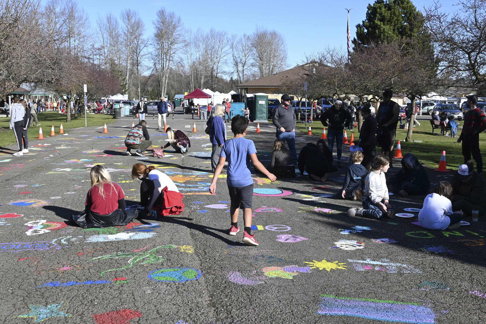 Youngsters and adults alike enjoy the Community Street Mural Art Project at Carrie Blake Park on March 5, part of the 2022 Sequim Sunshine Festival. Sequim Gazette photo by Michael Dashiell