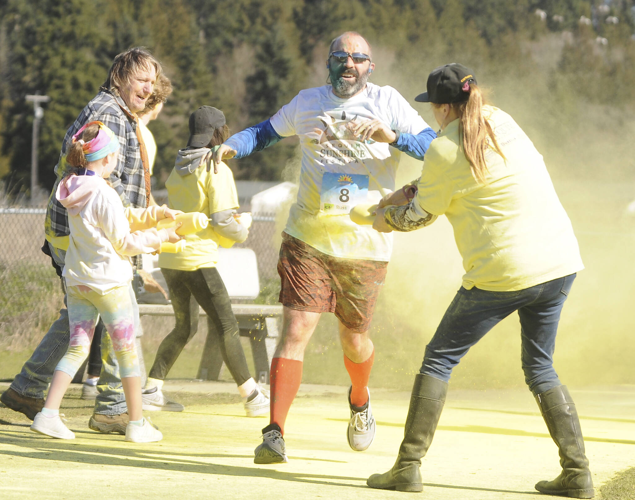 Russ Britton gets a splash of color from volunteers at the Sun Fun Color Run 5k Saturday morning at the Albert Haller Playfields just north of Carrie Blake Community Park. More than 500 participants were registered to run/walk 5k and 1k race. Sequim Gazette photo by Michael Dashiell