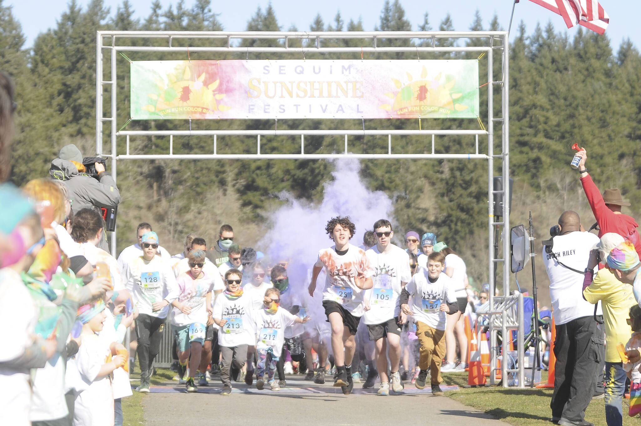 Sequim Gazette photo by Michael Dashiell Runners and walker break from the start of the Sun Fun Color Run 5k Saturday morning at the Albert Haller Playfields just north of Carrie Blake Community Park. More than 500 participants were registered.