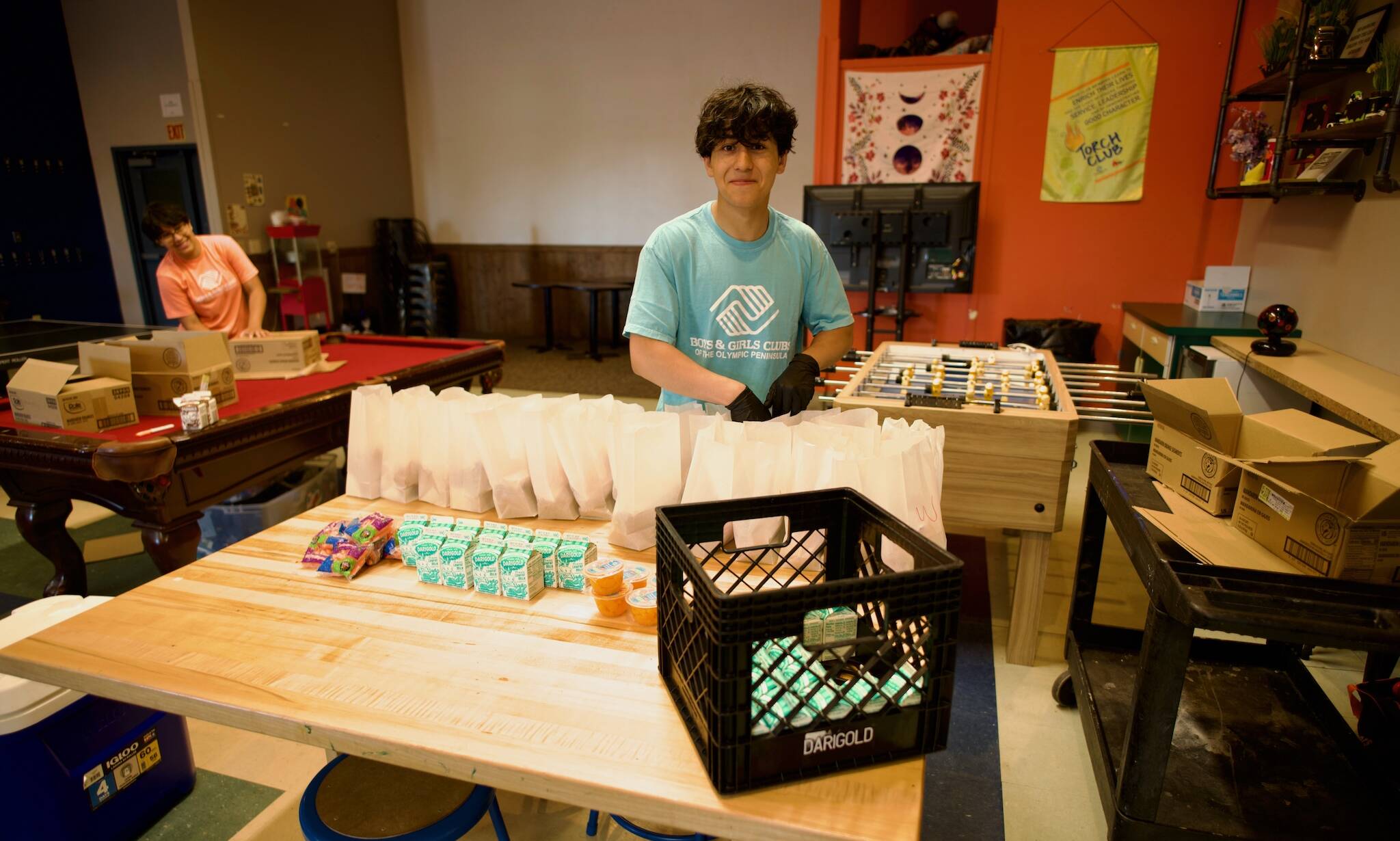 On a recent Tuesday morning, a handful of teens worked busily at tables inside the Carroll C. Kendall Boys & Girls Club in Sequim, placing food items into opened white paper bags. The selection was nutritious and substantial. Italian sub sandwiches. Snack-sized bags of snap peas. Fruit cups.