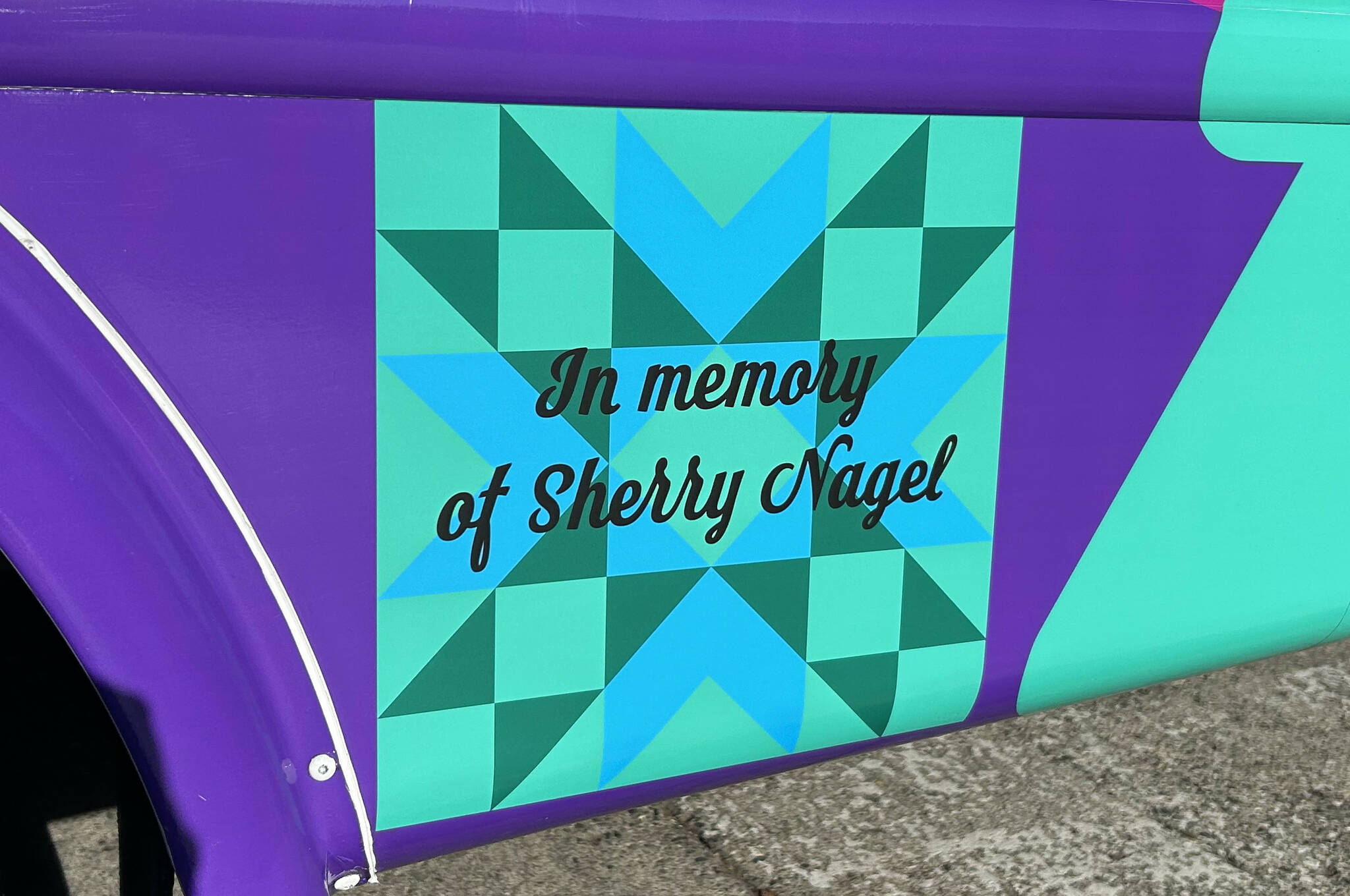 A quilt square on the side of the bus reads “In memory of Sherry Nagel.”