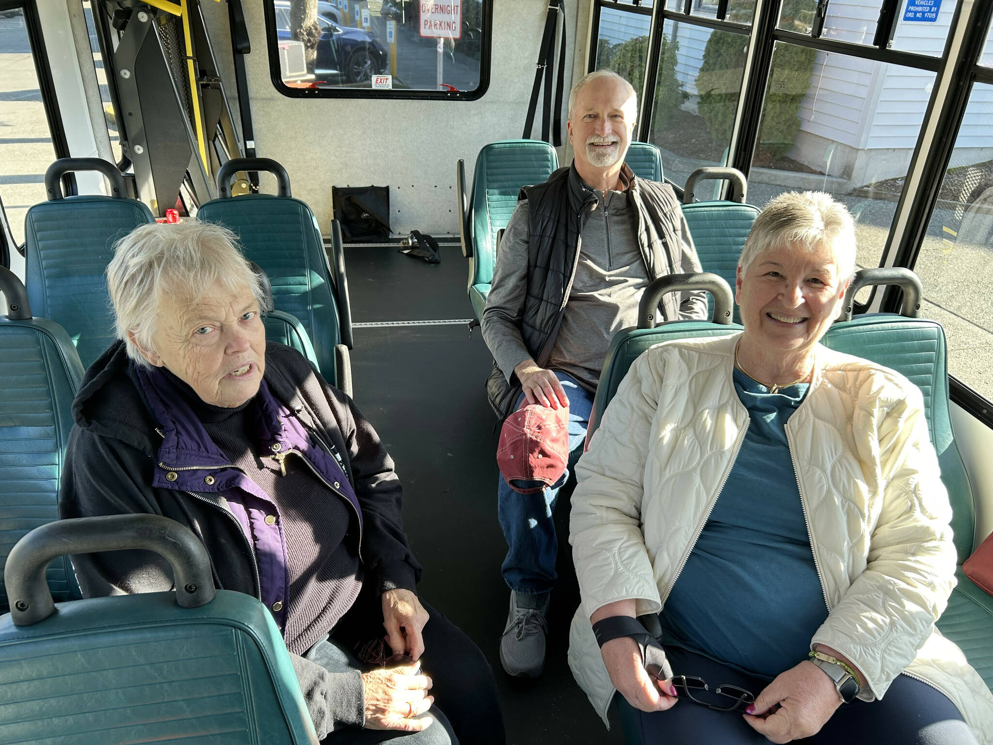 Sequim Gazette photo by Matthew Nash/ Maryln Lovell of Sequim and Barb and Mike Speer of Bonney Lake sit inside a new shuttle bus that the estate of their friend/sister Sherry Nagel paid for at the YMCA of Sequim to help transport seniors and children.