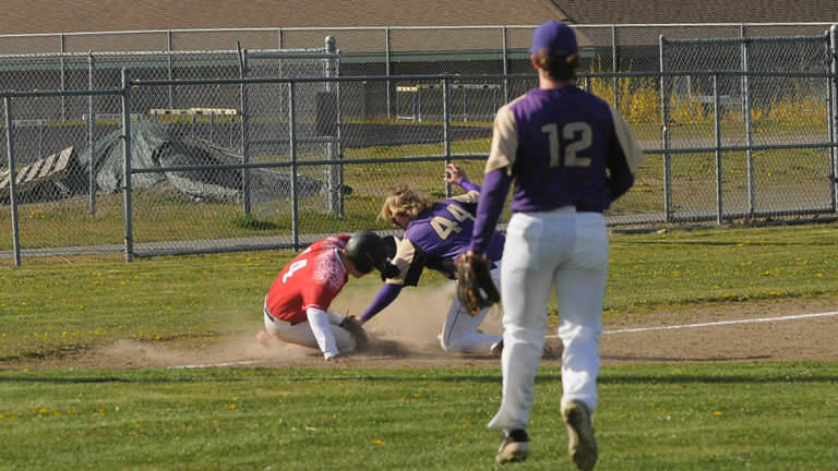 Sequim third baseman Ricky Jennings makes a successful tag to record an out in a non-league game against Crosspoint on April 15. Sequim Gazette photo by Michael Dashiell